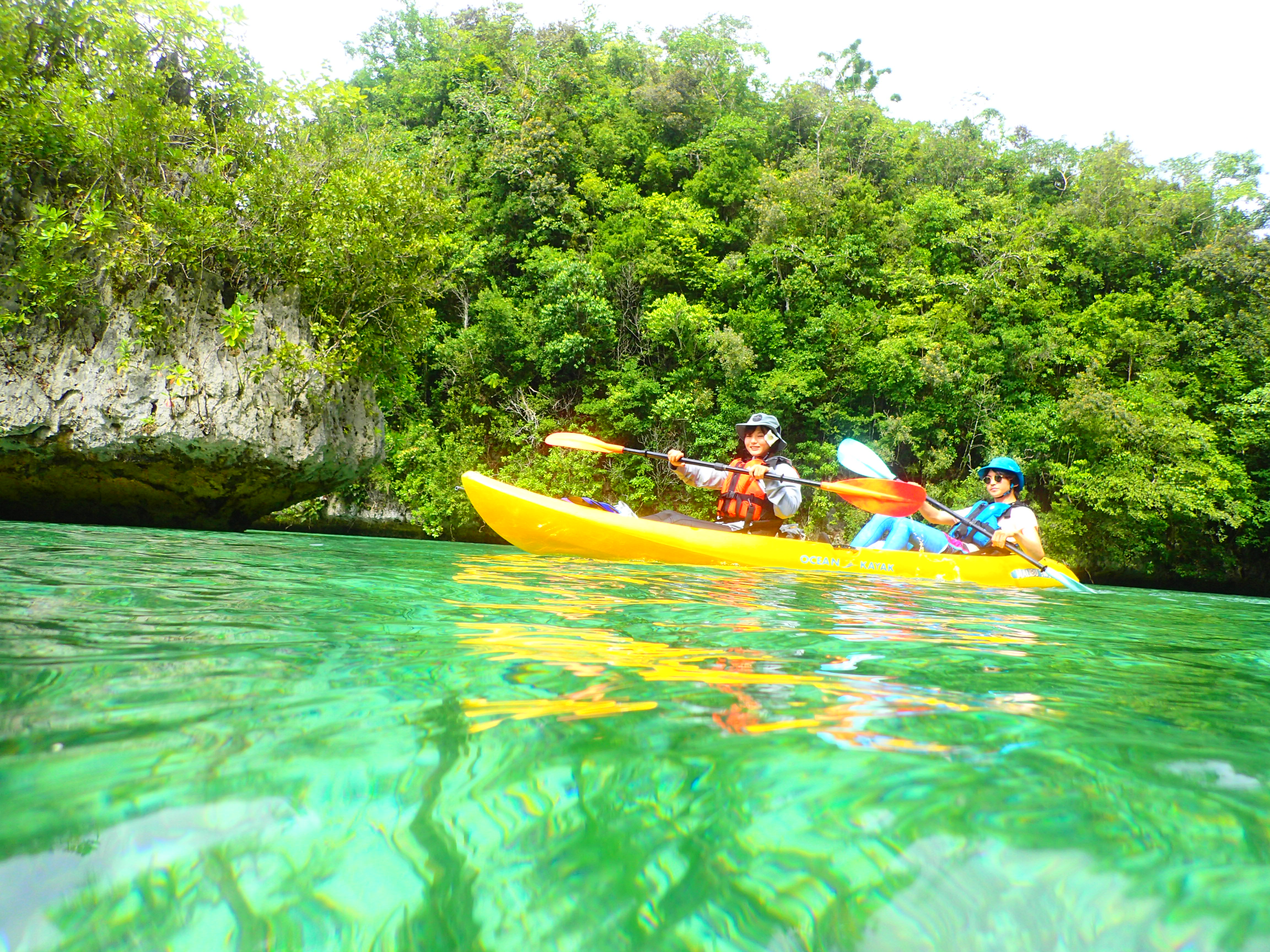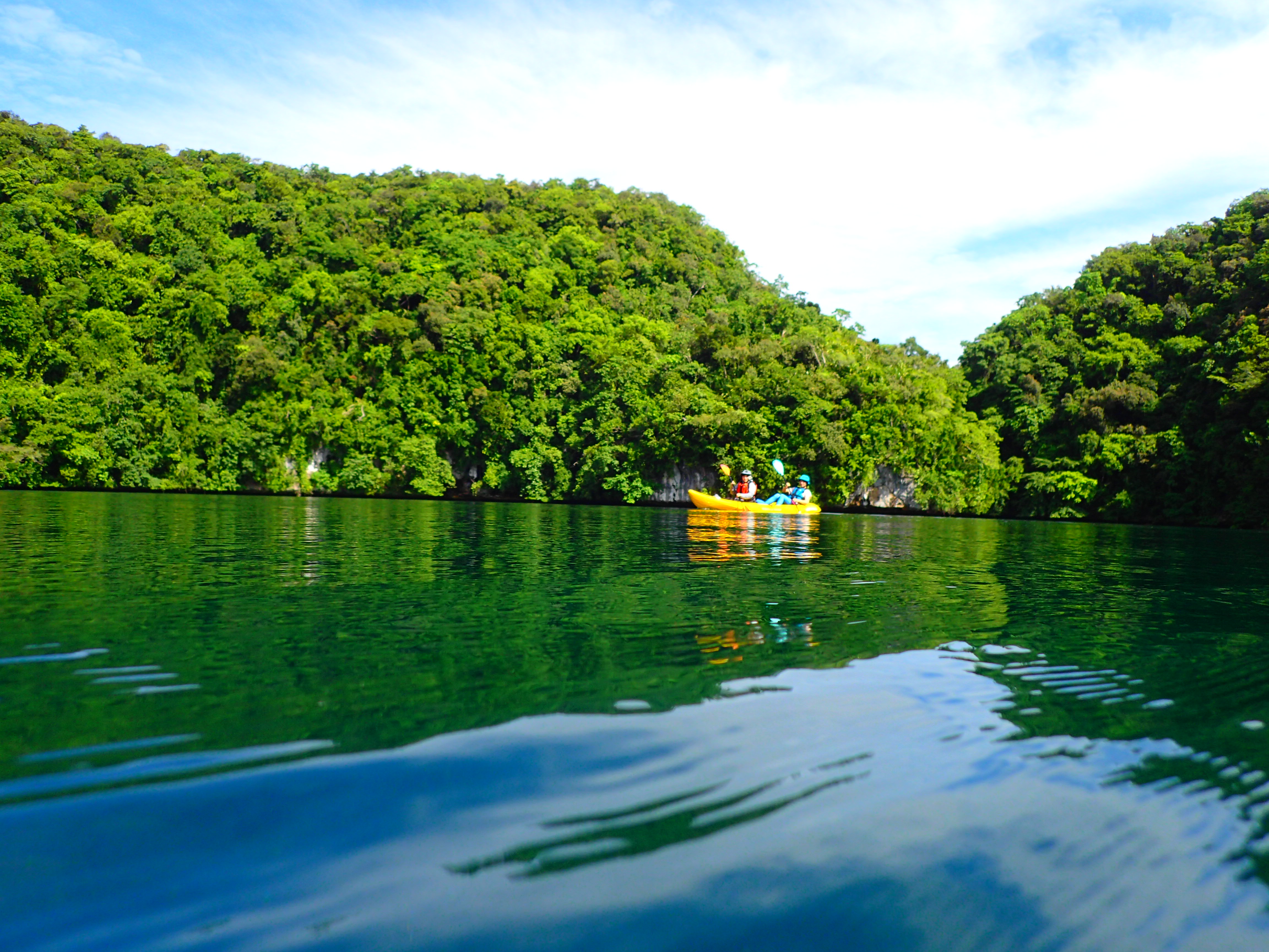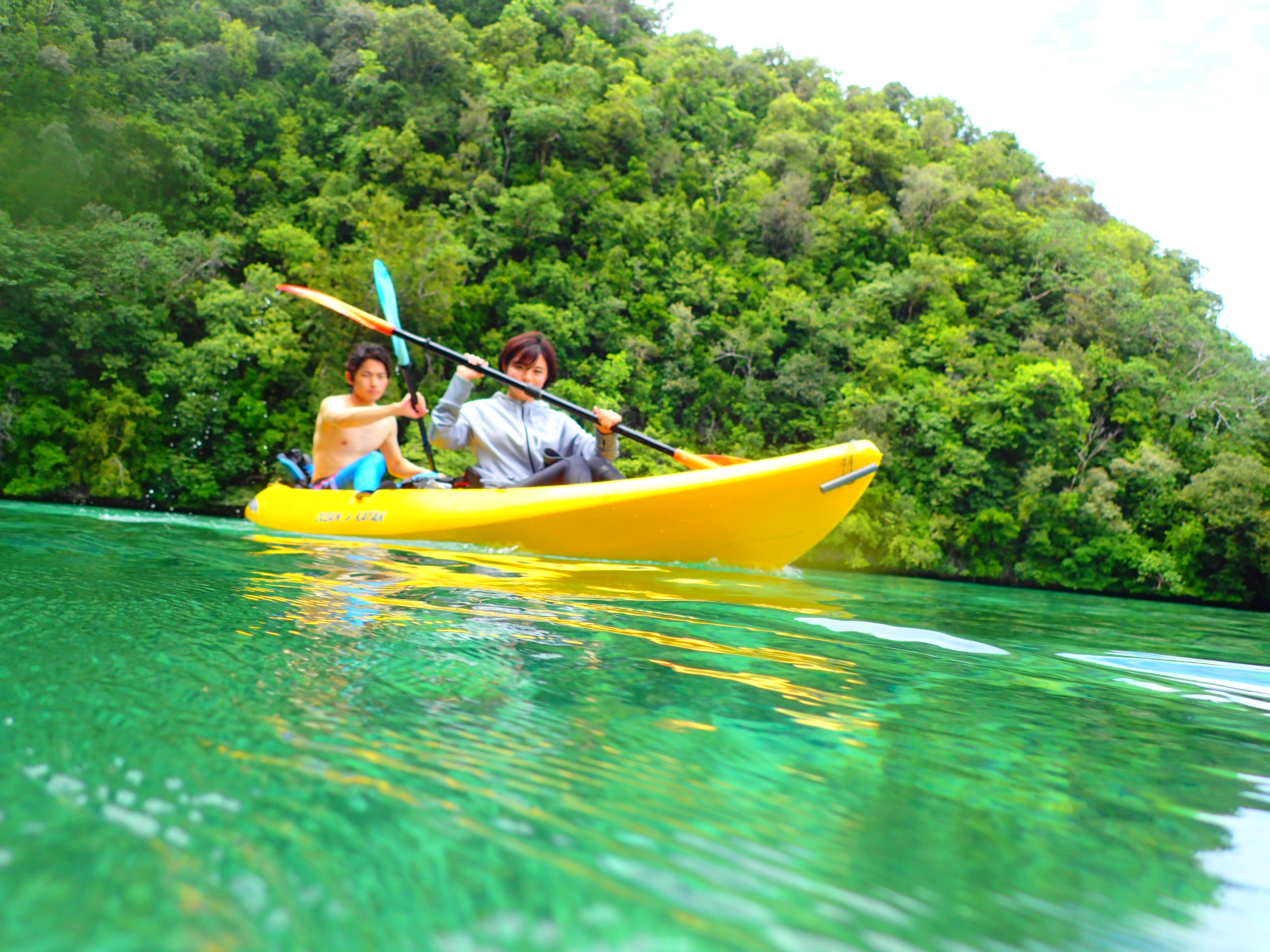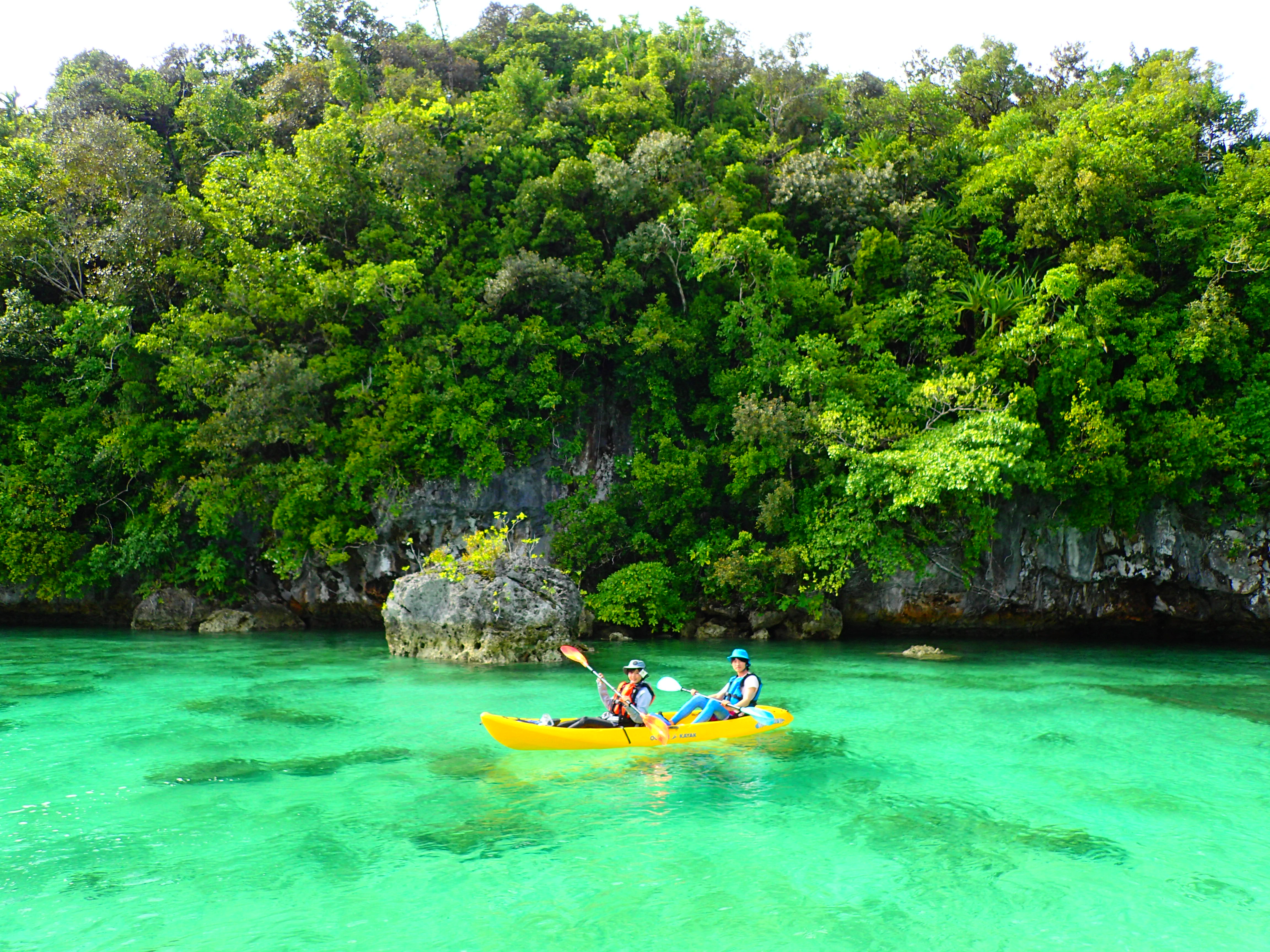 普段は半日ではここまで漕ぎませんが、コツを掴むと意外と進めちゃうんです、カヤック。またパラオ松島と呼ばれる穏やかな入江は波も無く、