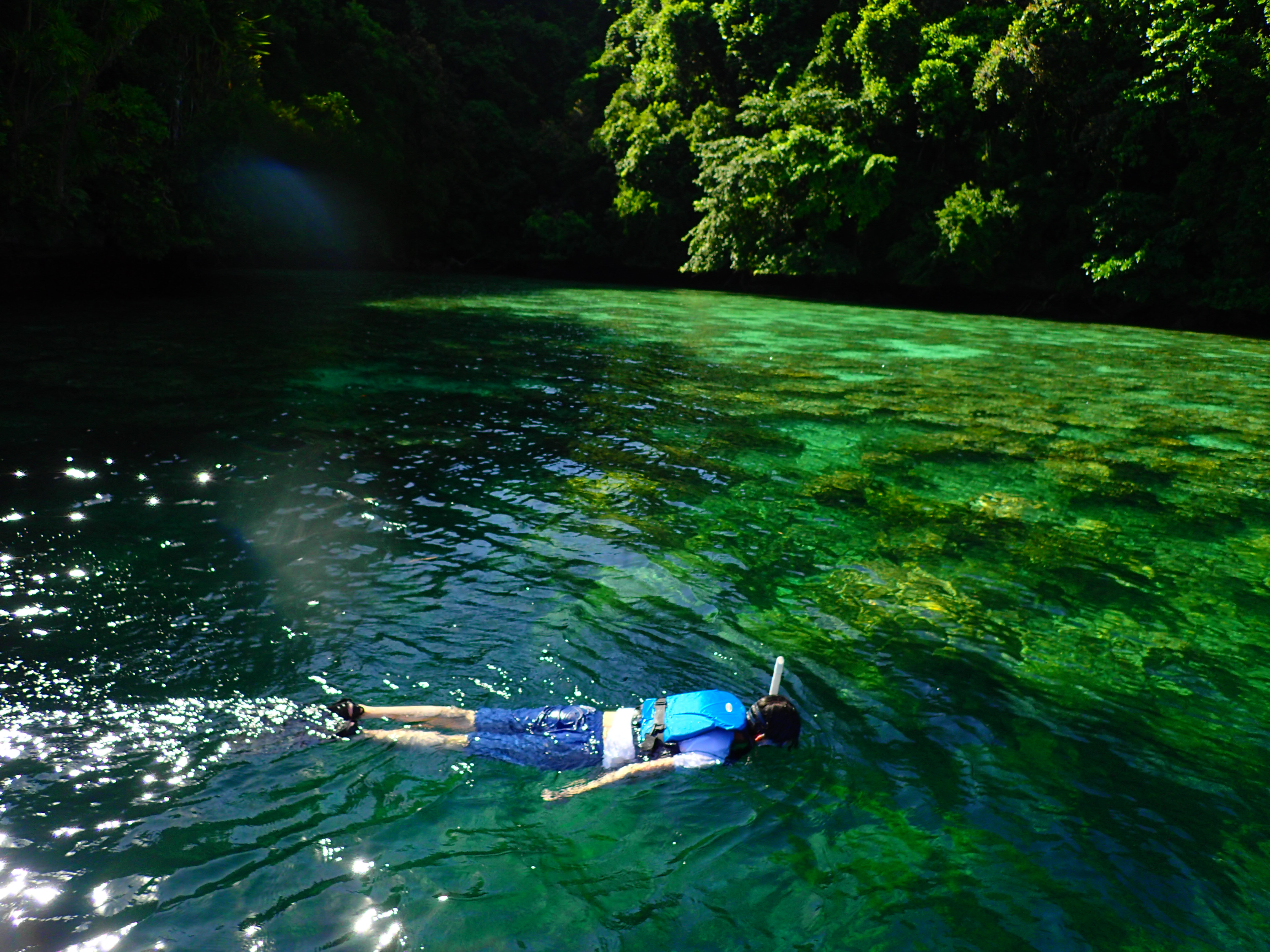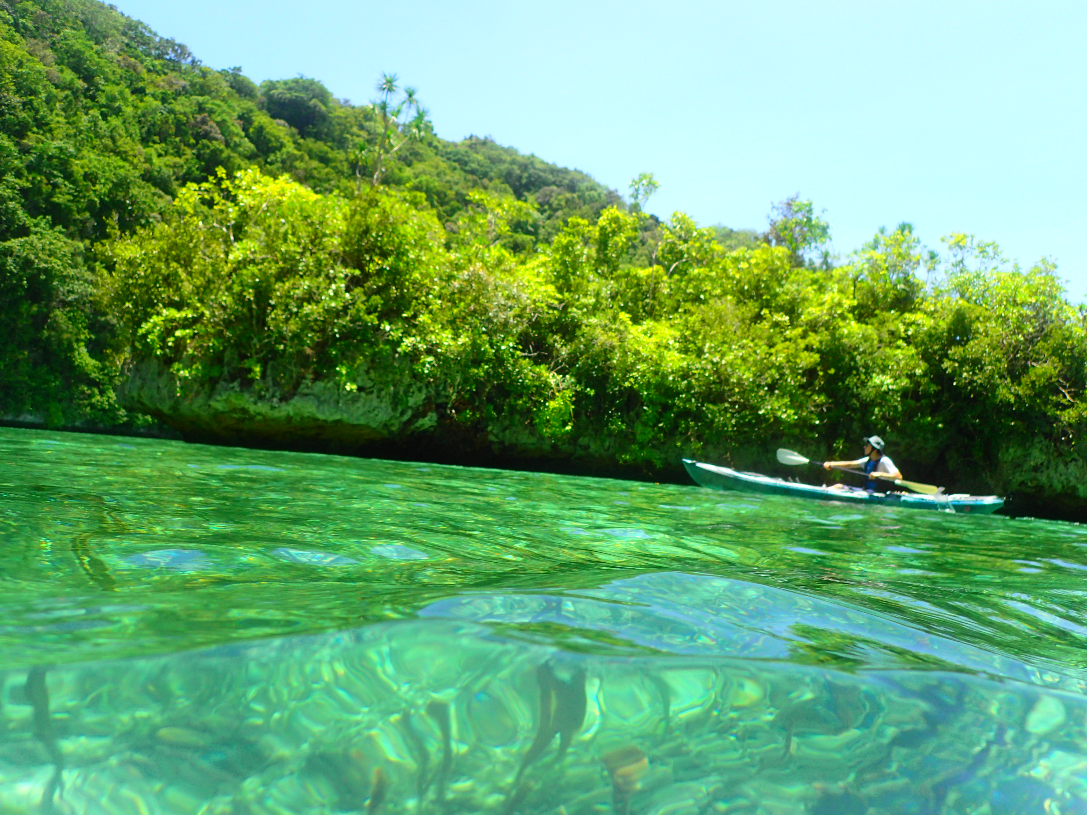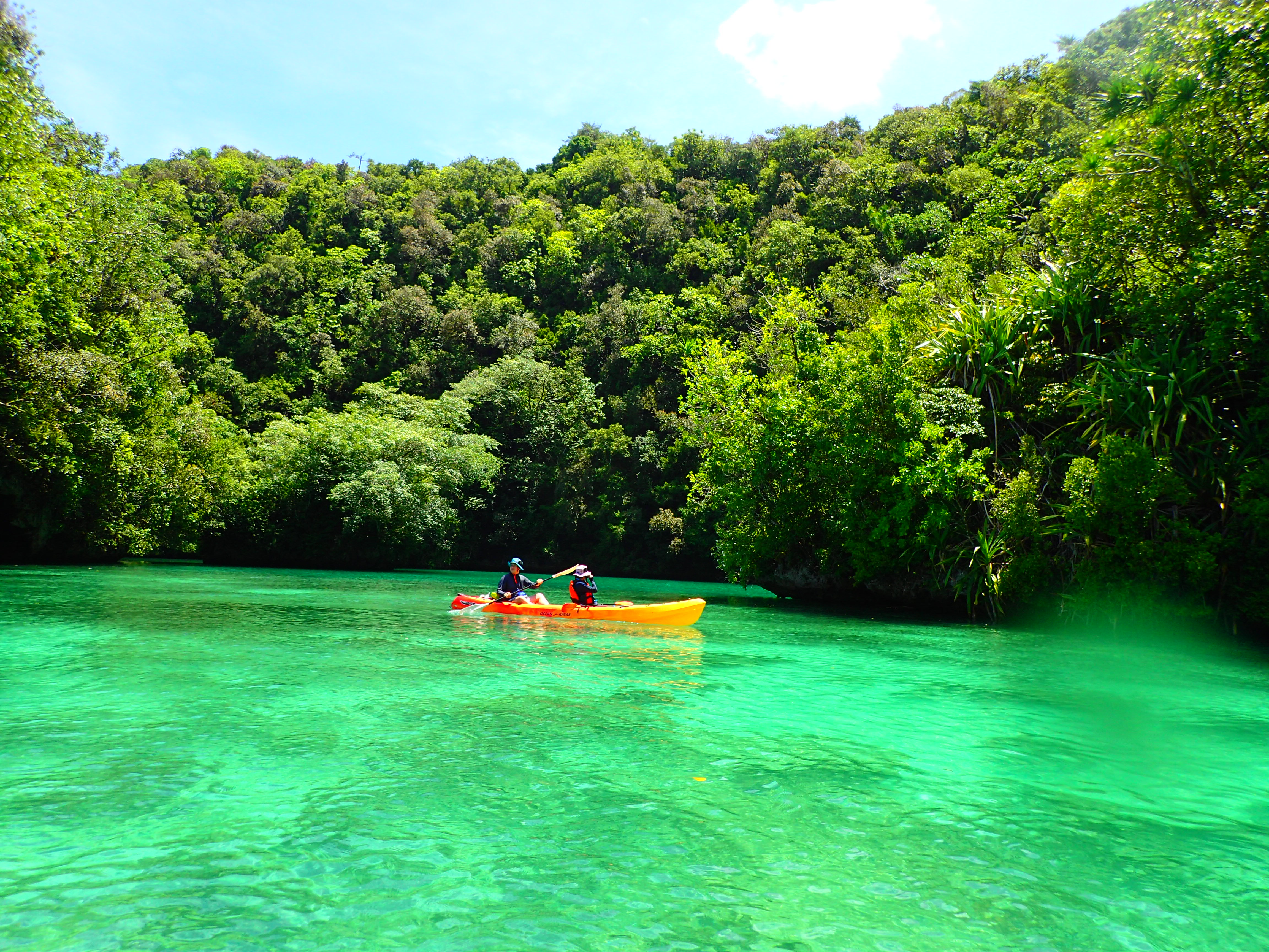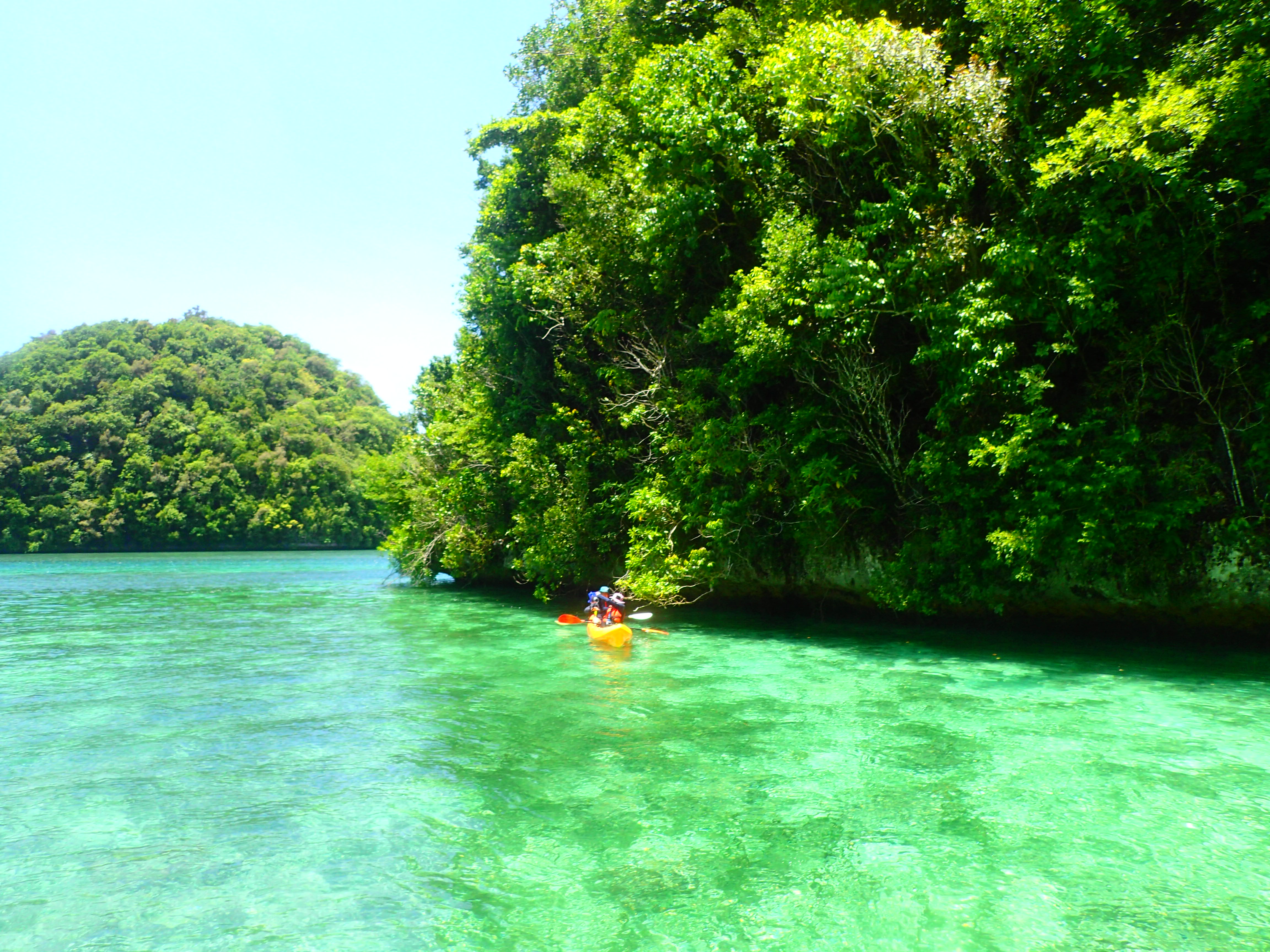 海と湖の間。穏やかな入江は覗いてみると中々素敵です。派手さは無いものの、独特の魅力があり、お客様に声を掛けないで見守っていると皆様かなりの時間スノーケルを楽しんでいます。カヤックからドボン!とスノーケルをするのはワンダフルワールド・パラオ独特の遊び方。カヤックに上がる際はお手伝いしまうのでご安心ください。