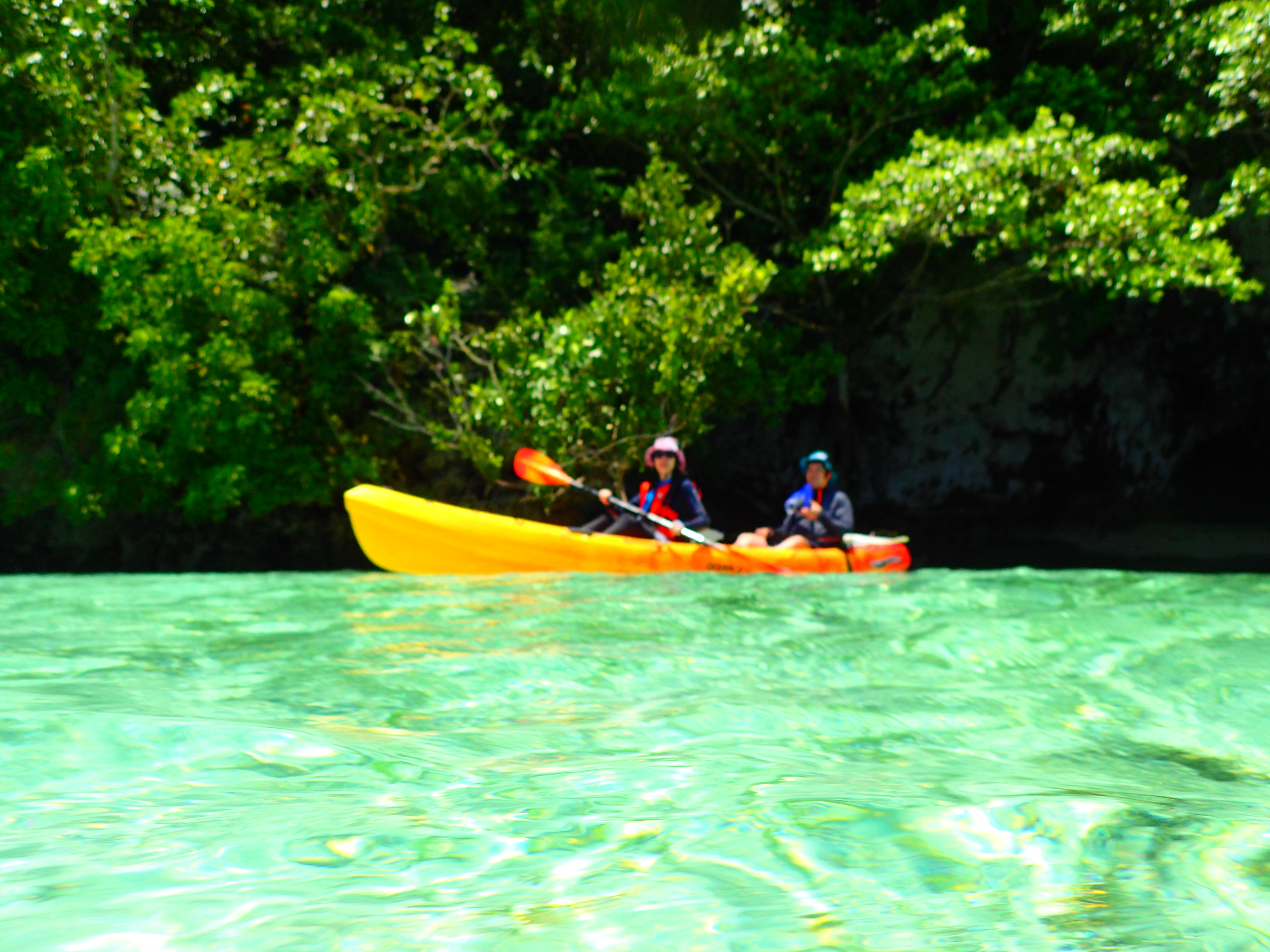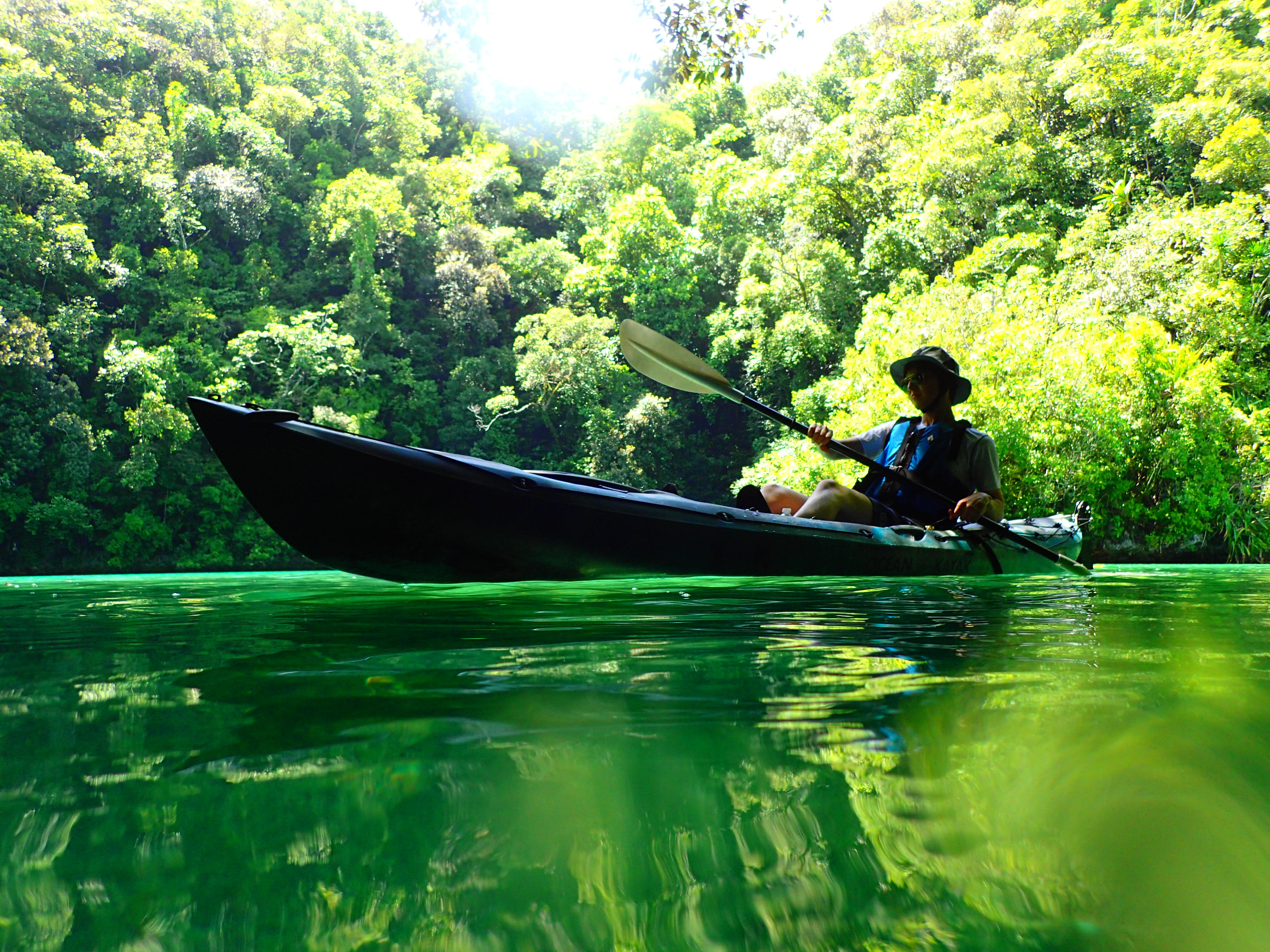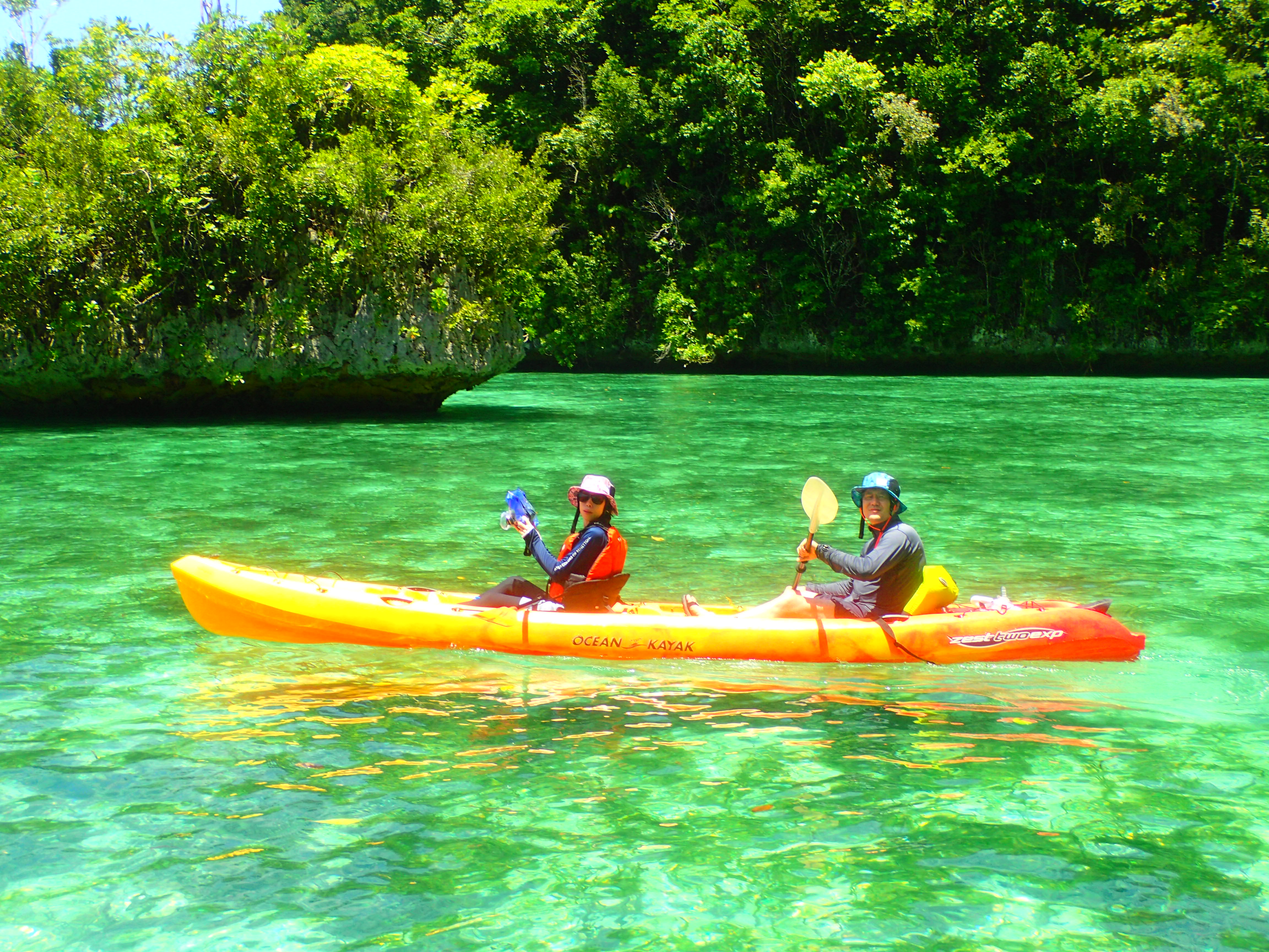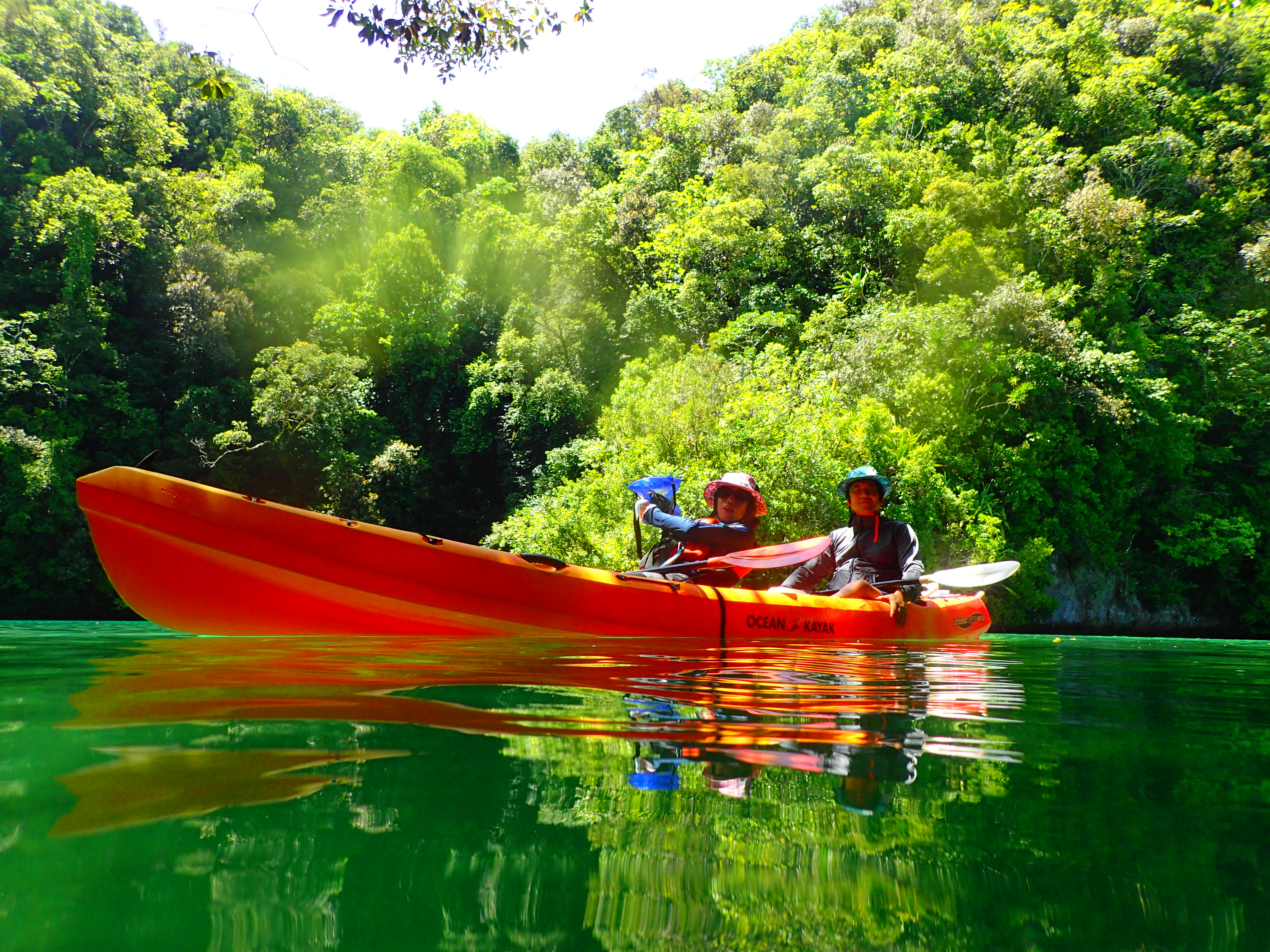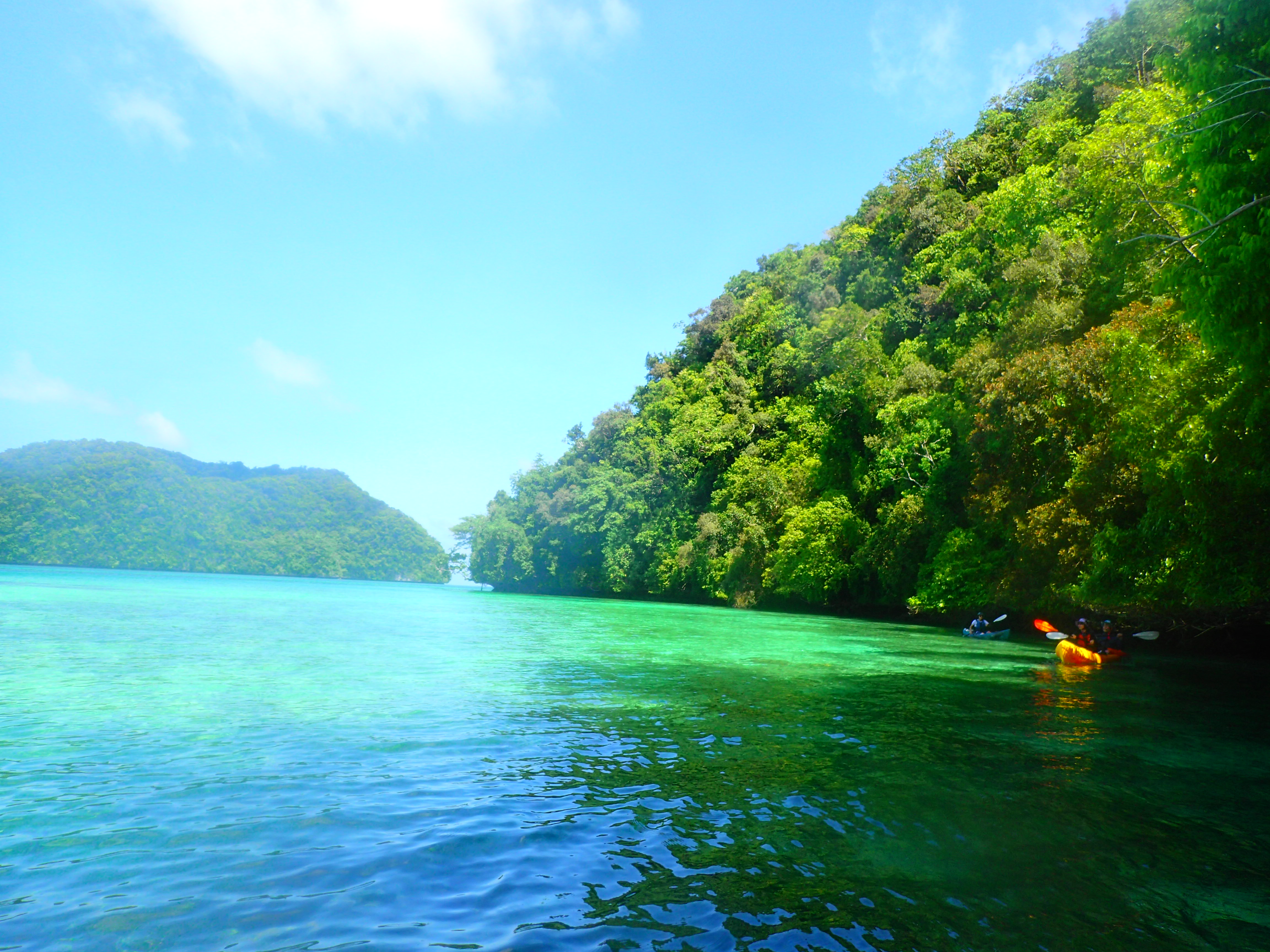 海と湖の間。穏やかな入江は覗いてみると中々素敵です。派手さは無いものの、独特の魅力があり、お客様に声を掛けないで見守っていると皆様かなりの時間スノーケルを楽しんでいます。カヤックからドボン!とスノーケルをするのはワンダフルワールド・パラオ独特の遊び方。カヤックに上がる際はお手伝いしまうのでご安心ください。
