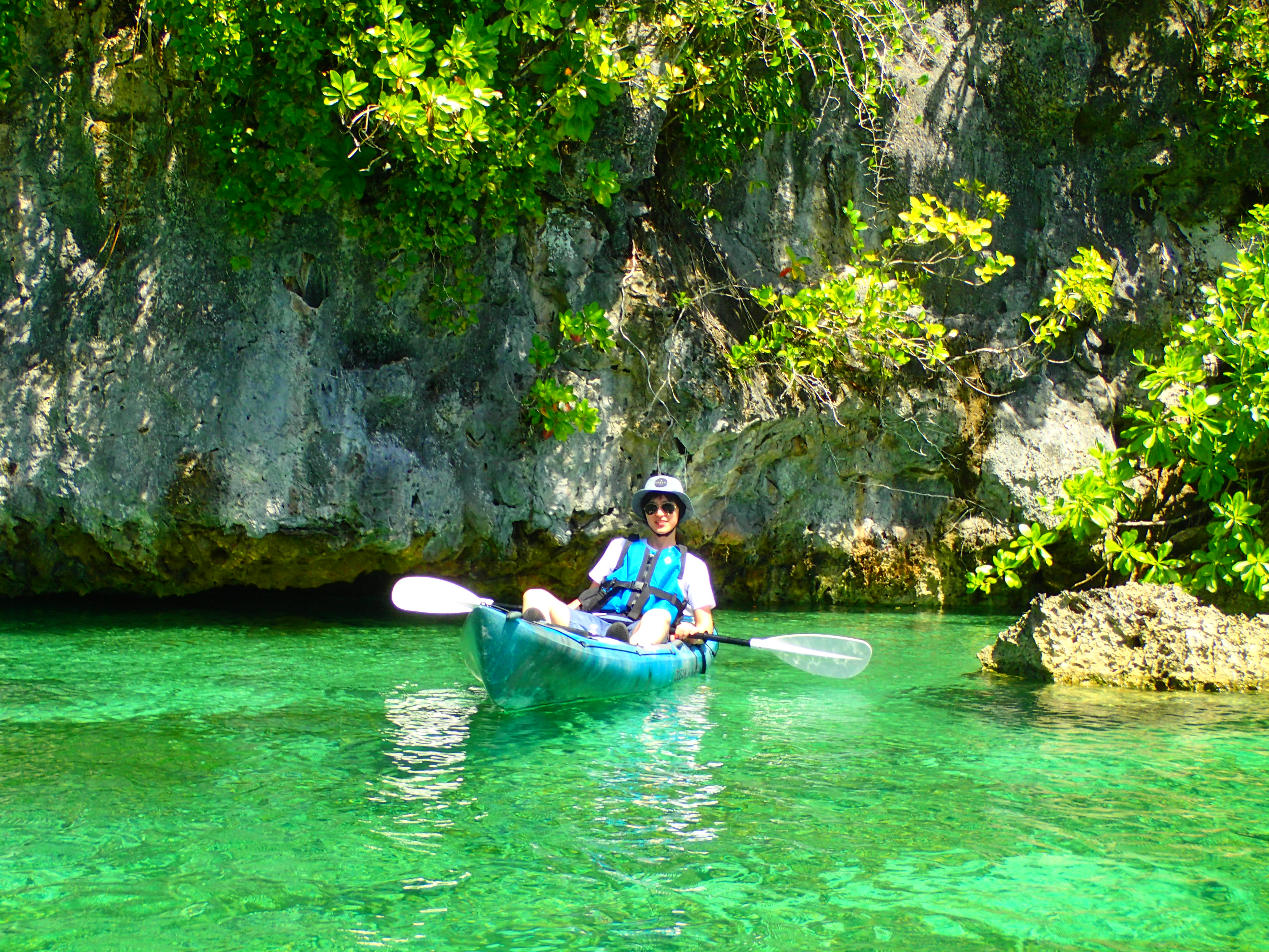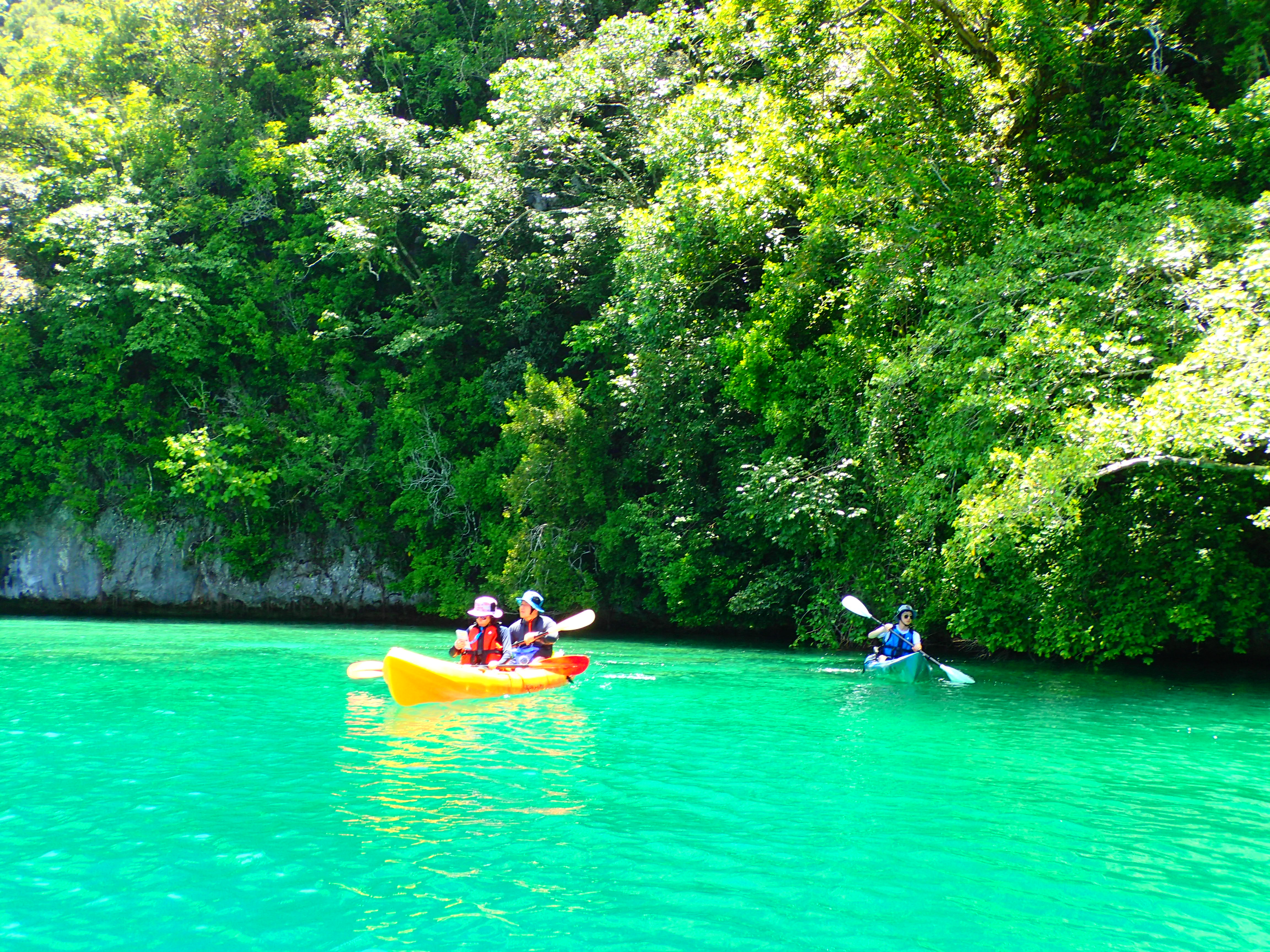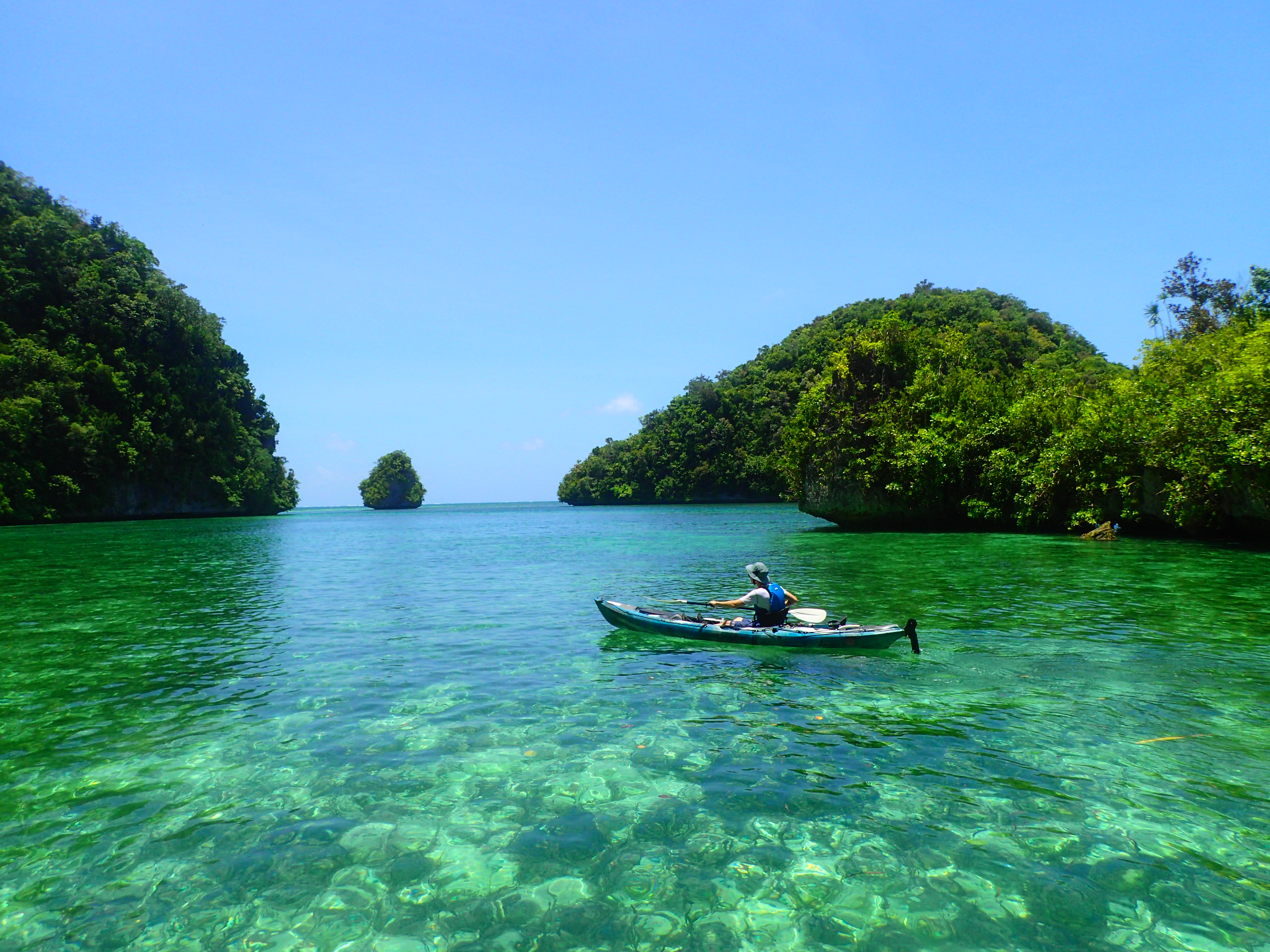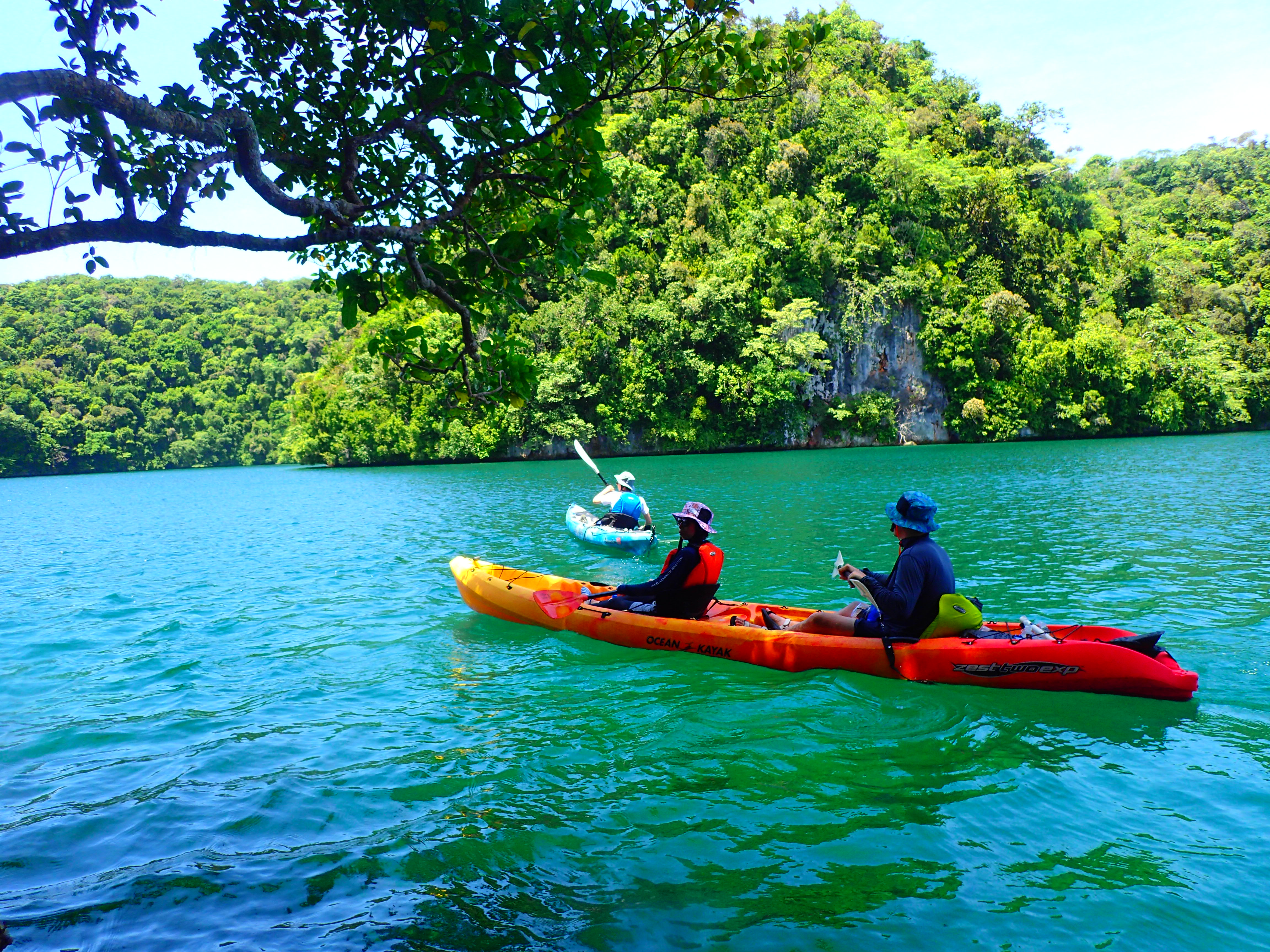 海と湖の間。穏やかな入江は覗いてみると中々素敵です。派手さは無いものの、独特の魅力があり、お客様に声を掛けないで見守っていると皆様かなりの時間スノーケルを楽しんでいます。カヤックからドボン!とスノーケルをするのはワンダフルワールド・パラオ独特の遊び方。カヤックに上がる際はお手伝いしまうのでご安心ください。