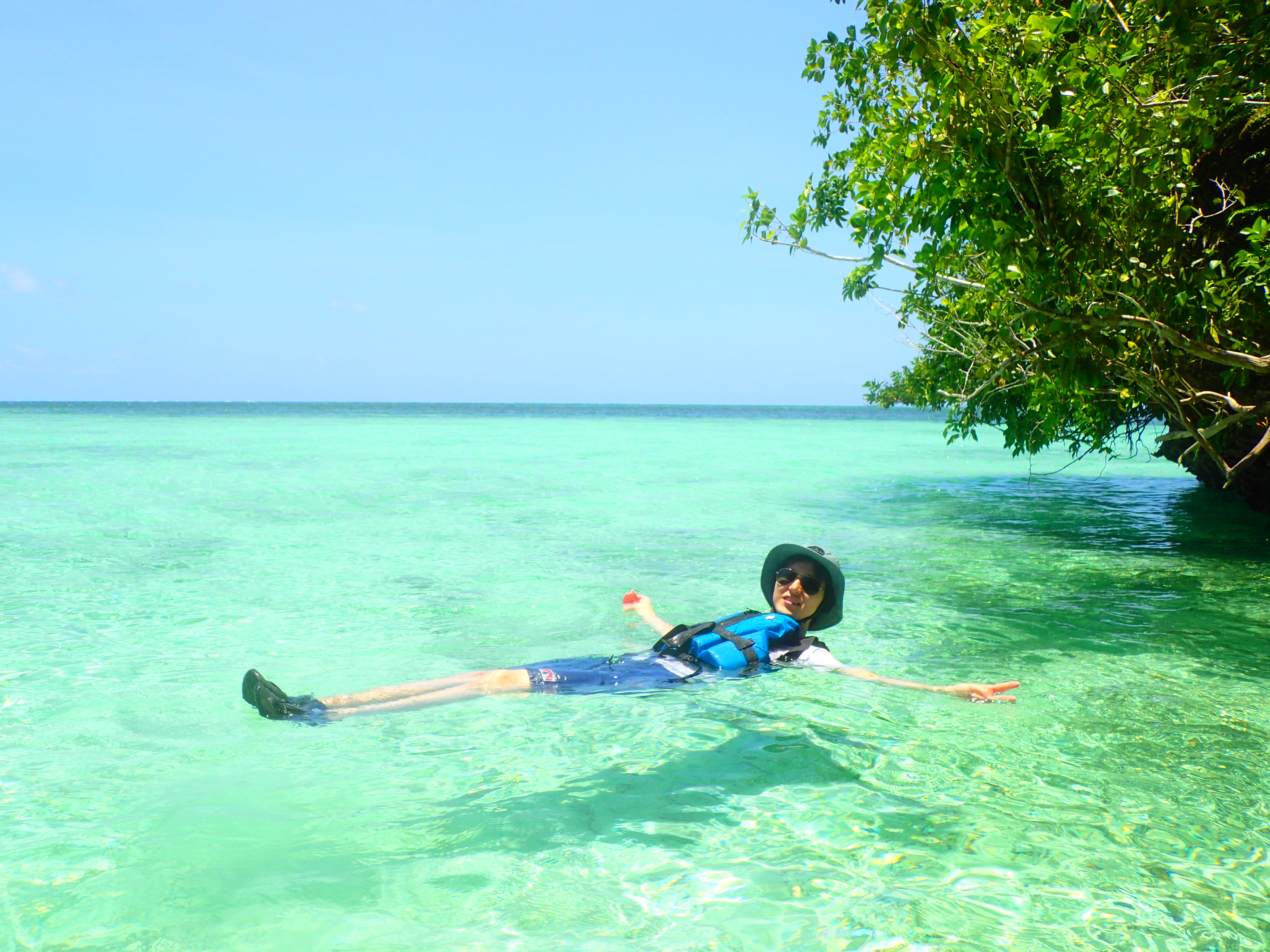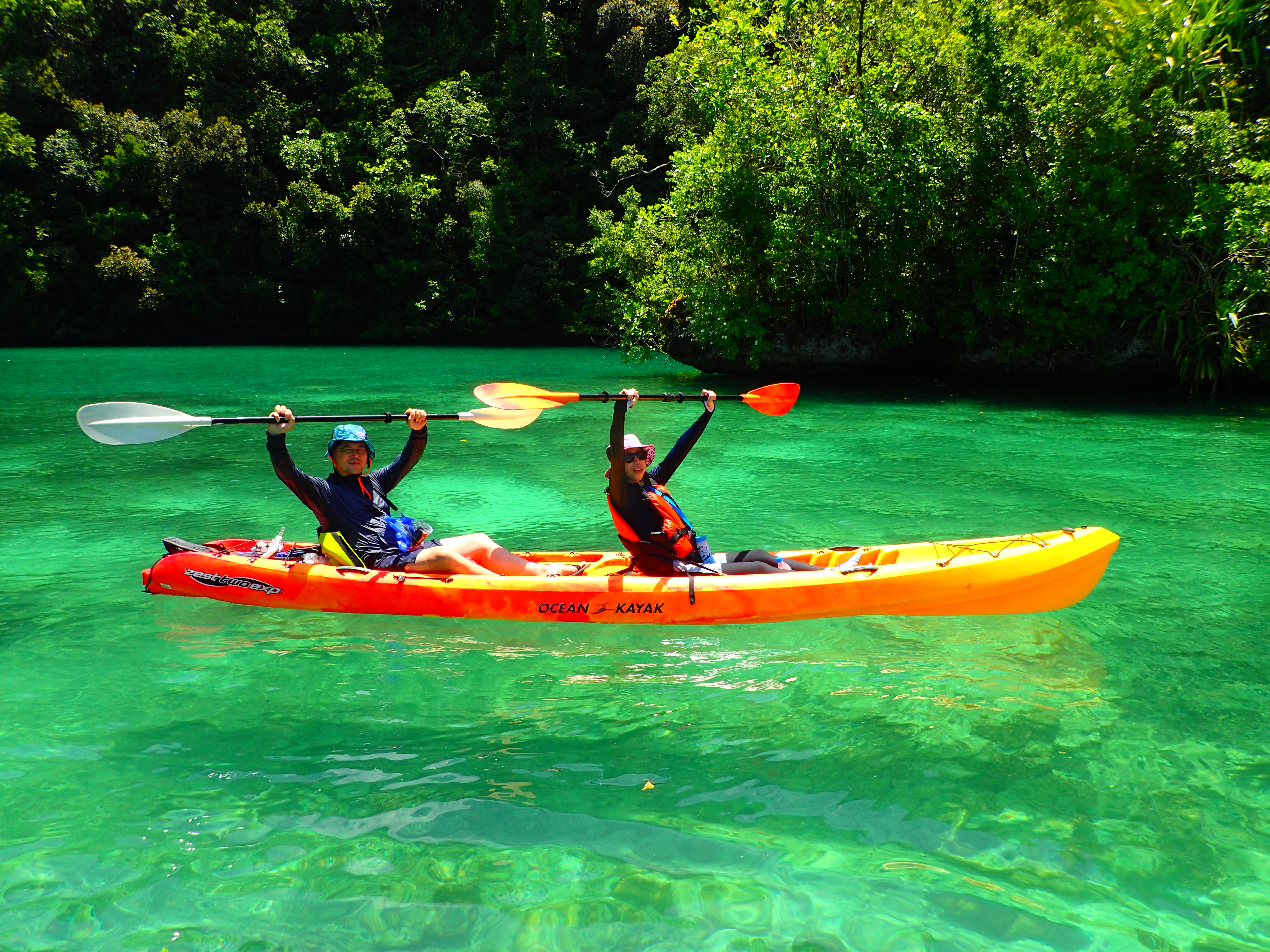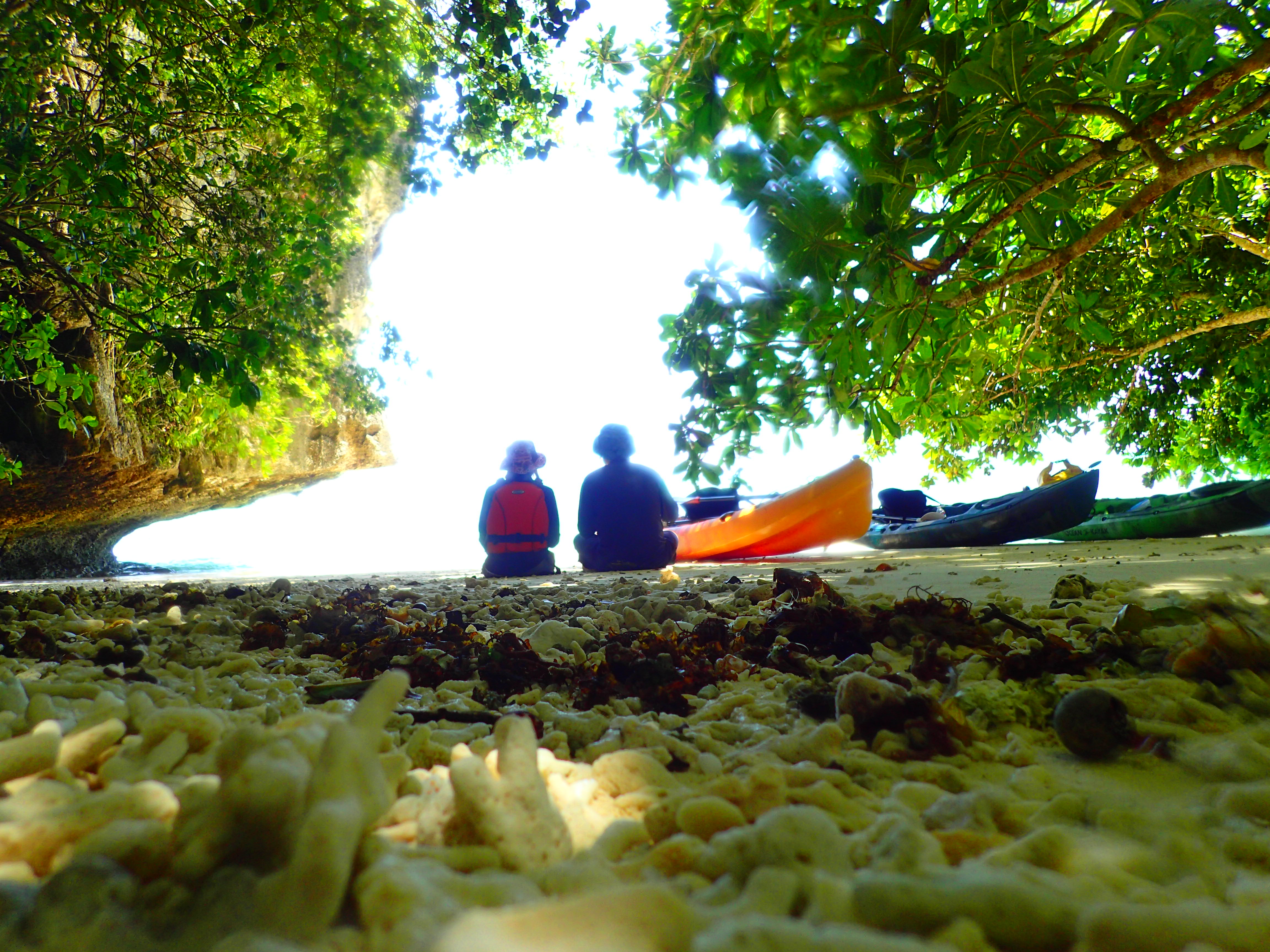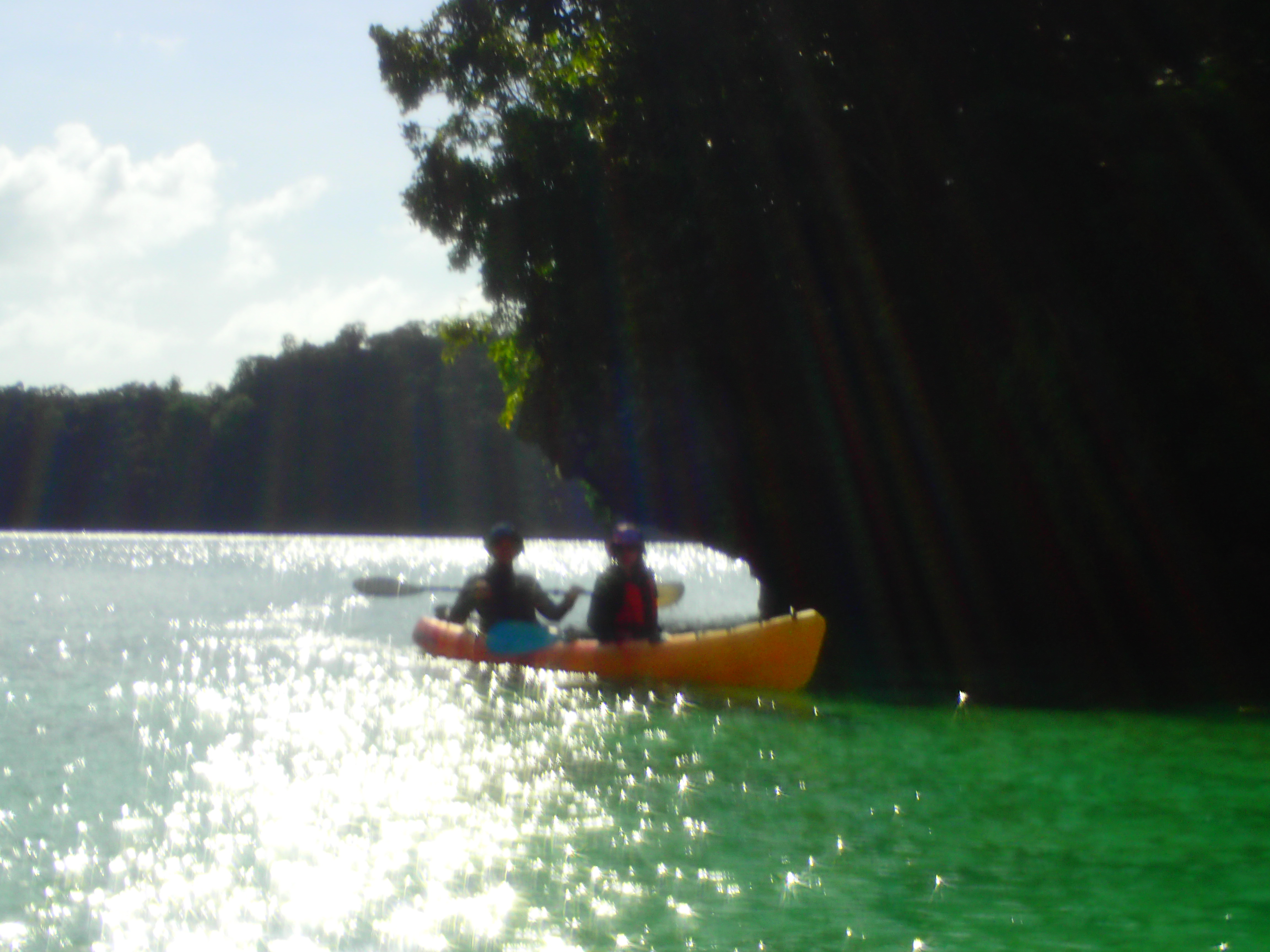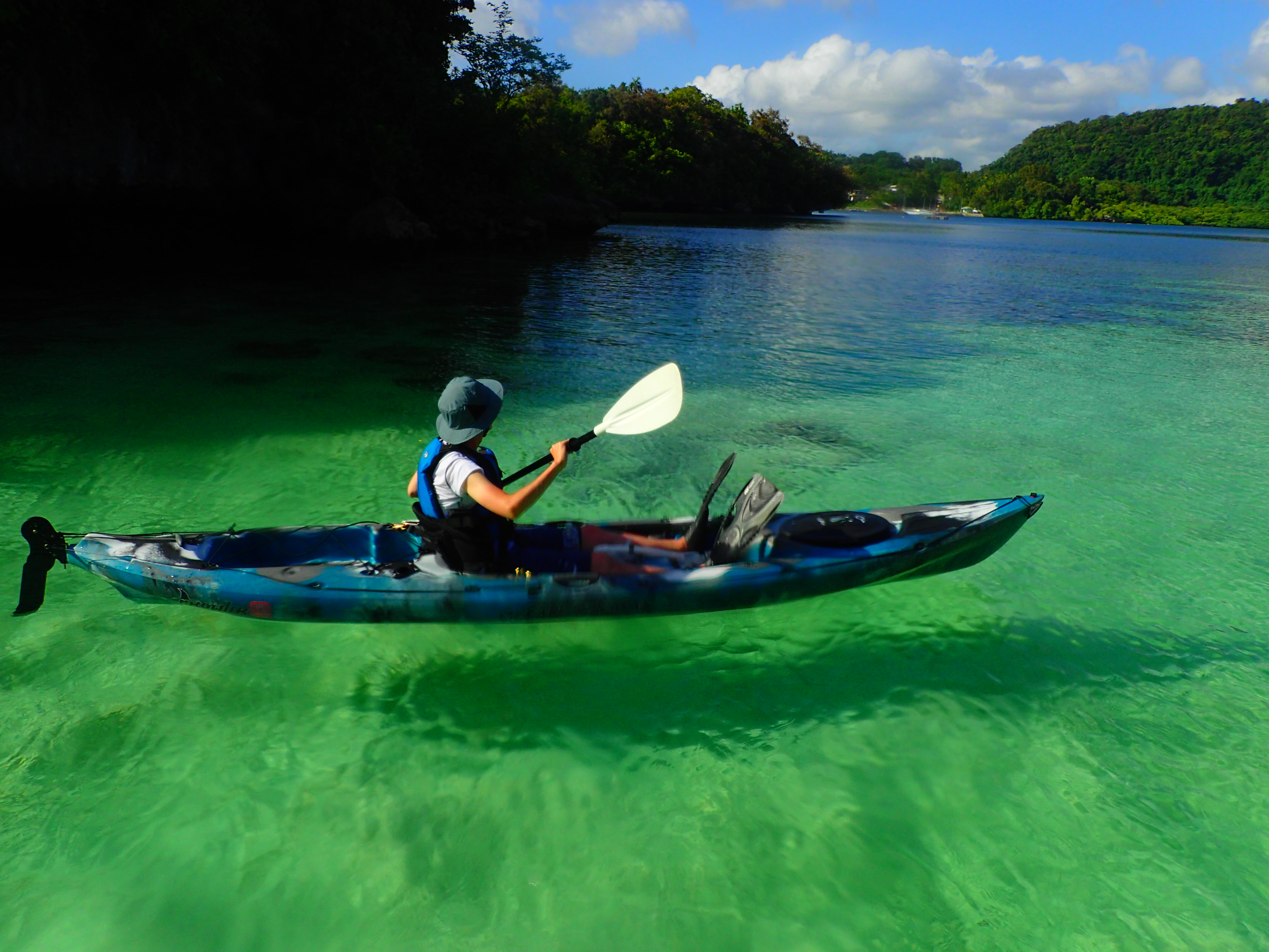 海と湖の間。穏やかな入江は覗いてみると中々素敵です。派手さは無いものの、独特の魅力があり、お客様に声を掛けないで見守っていると皆様かなりの時間スノーケルを楽しんでいます。カヤックからドボン!とスノーケルをするのはワンダフルワールド・パラオ独特の遊び方。カヤックに上がる際はお手伝いしまうのでご安心ください。