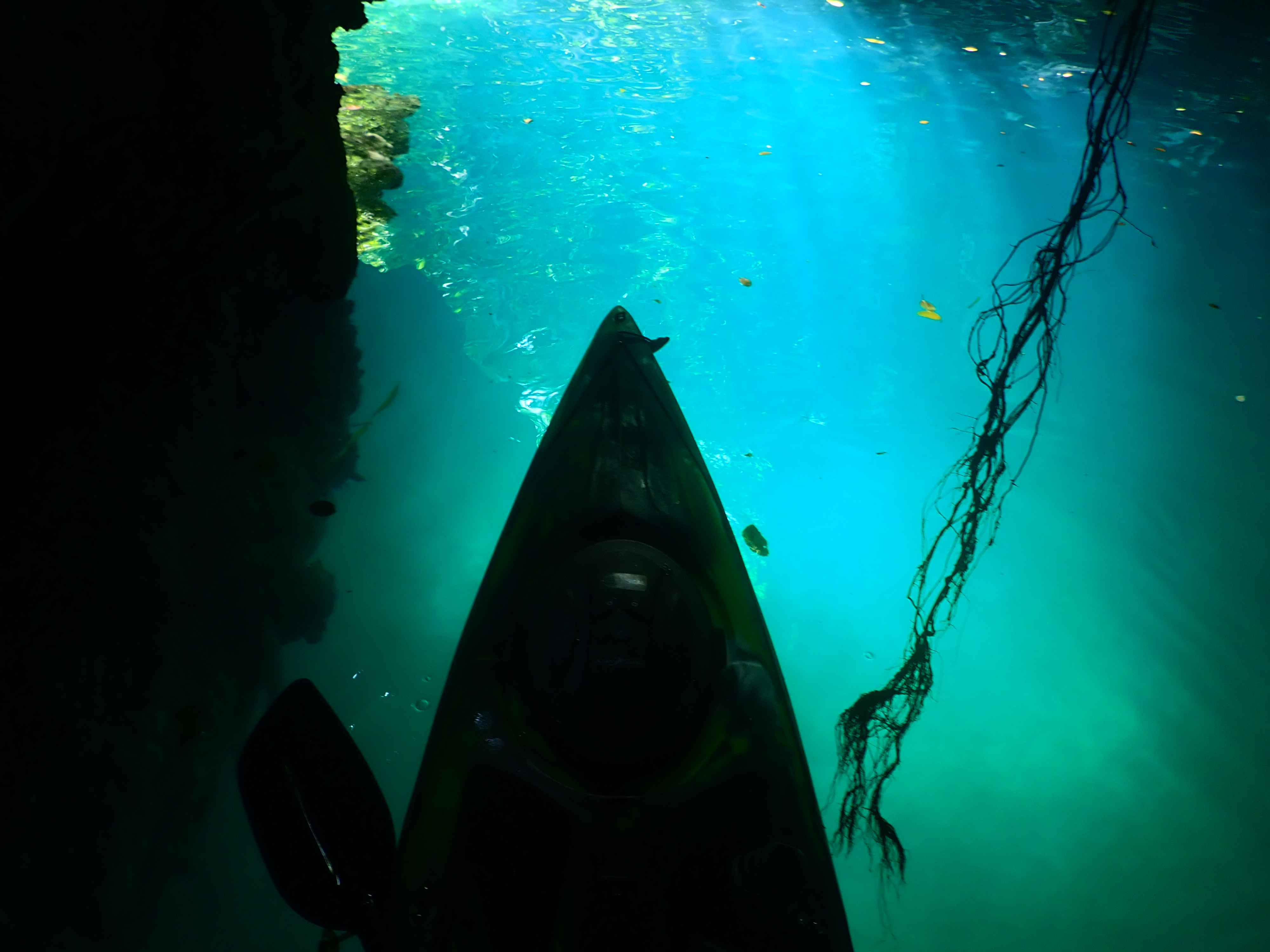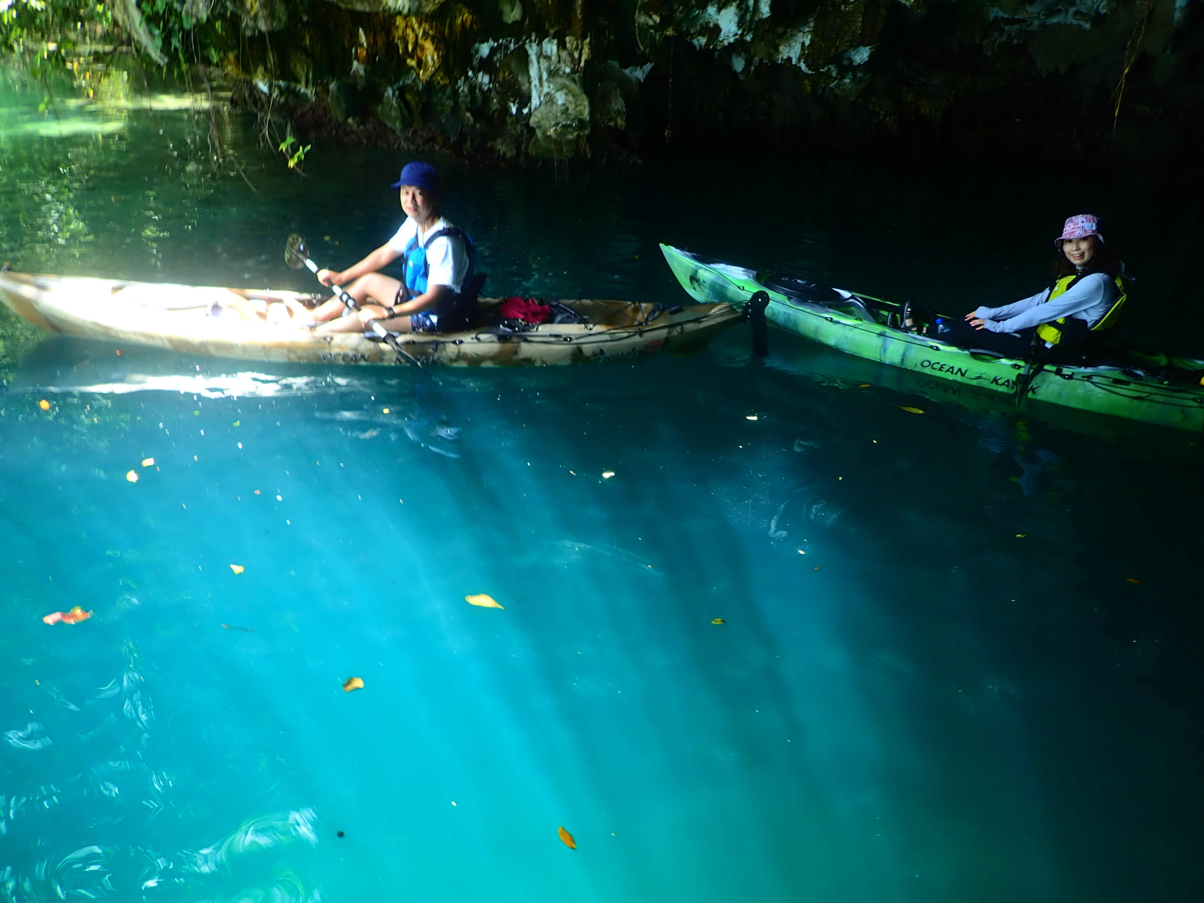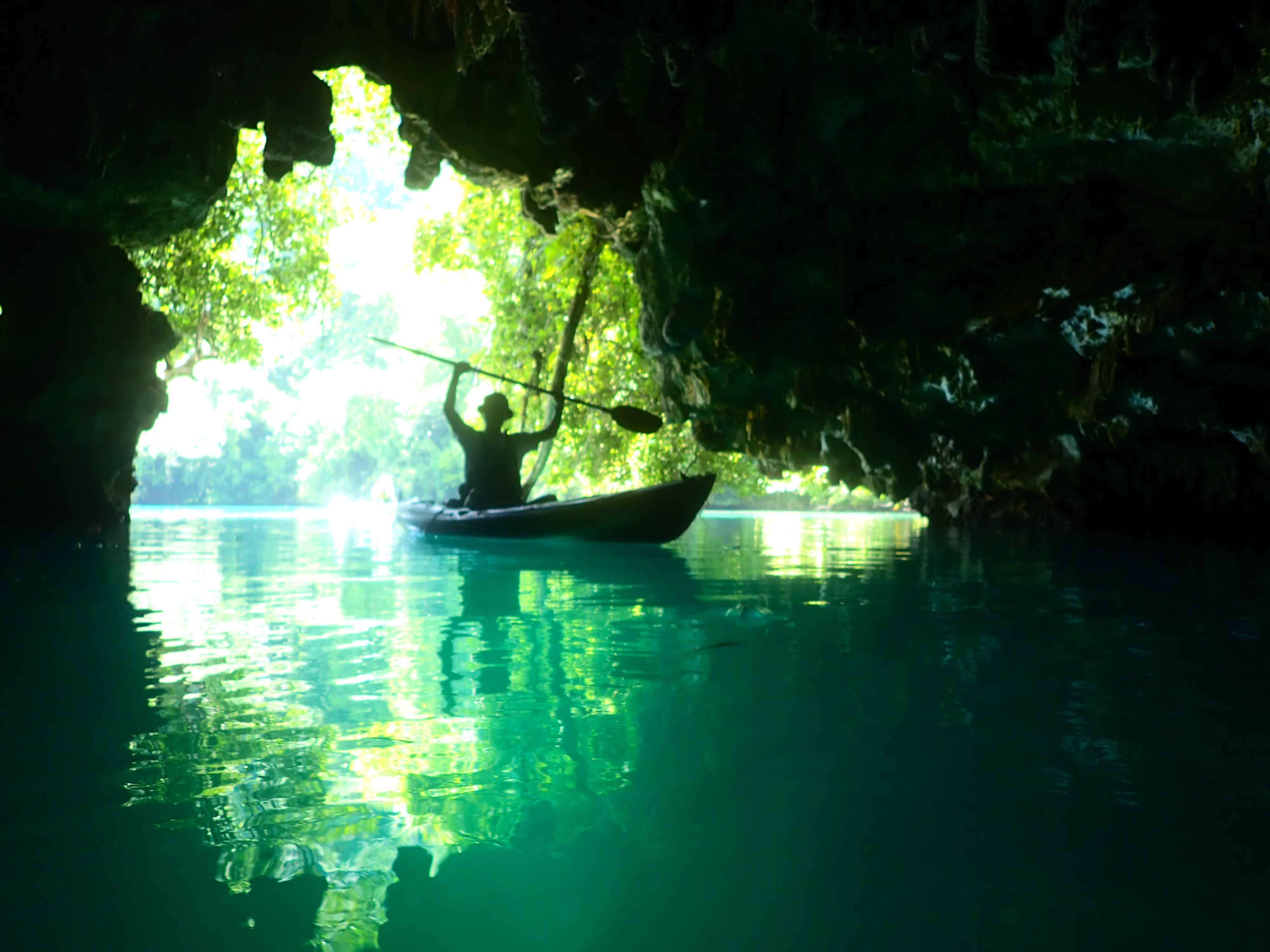 目的地のエメラルドケイヴに到着。半日ツアーでは少々距離がありますが、行ってみると「頑張って漕いできて良かった..」と思えます。洞窟内の淡いエメラルドグリーンの海が幻想的な雰囲気を醸し出しています。