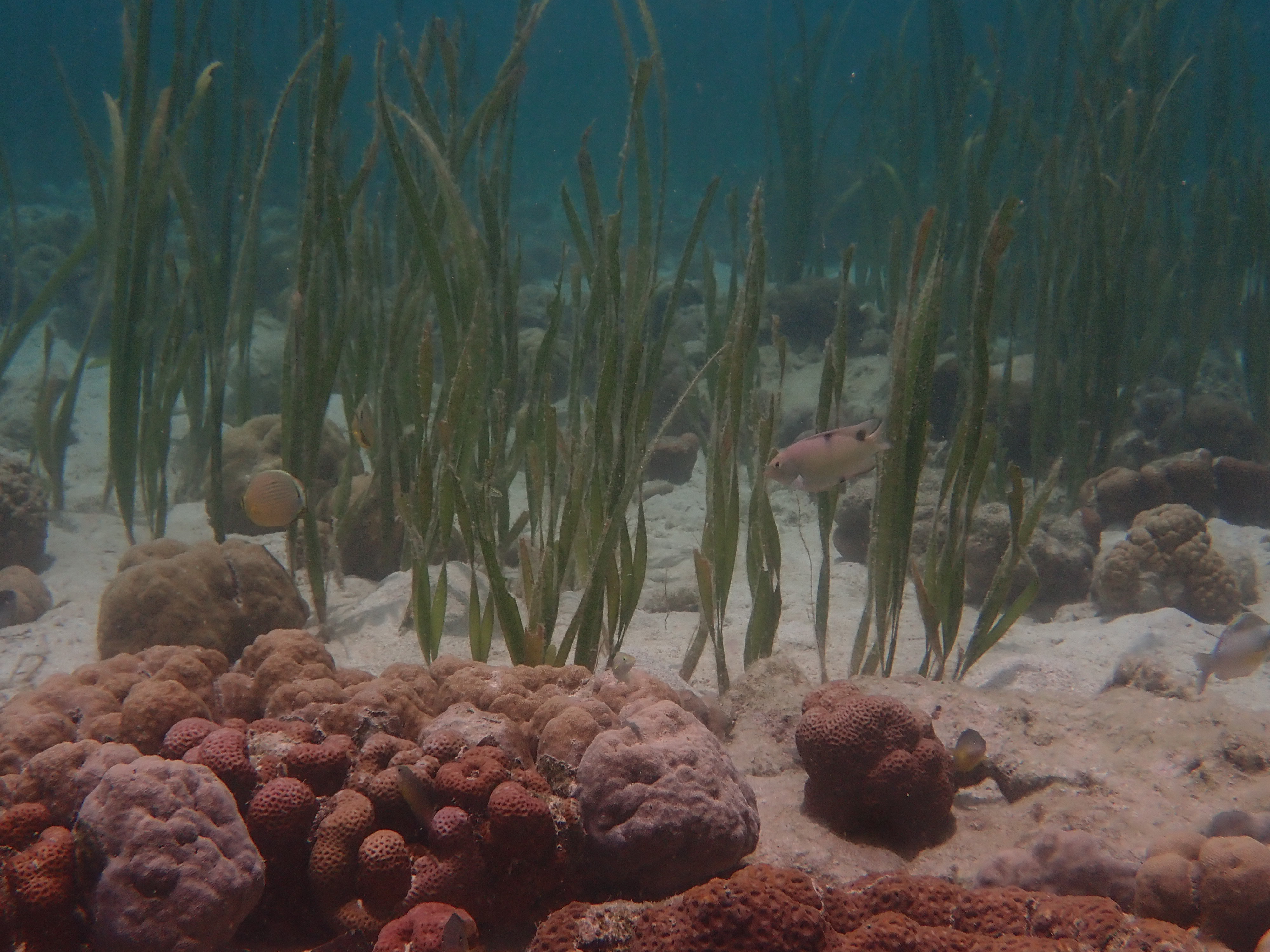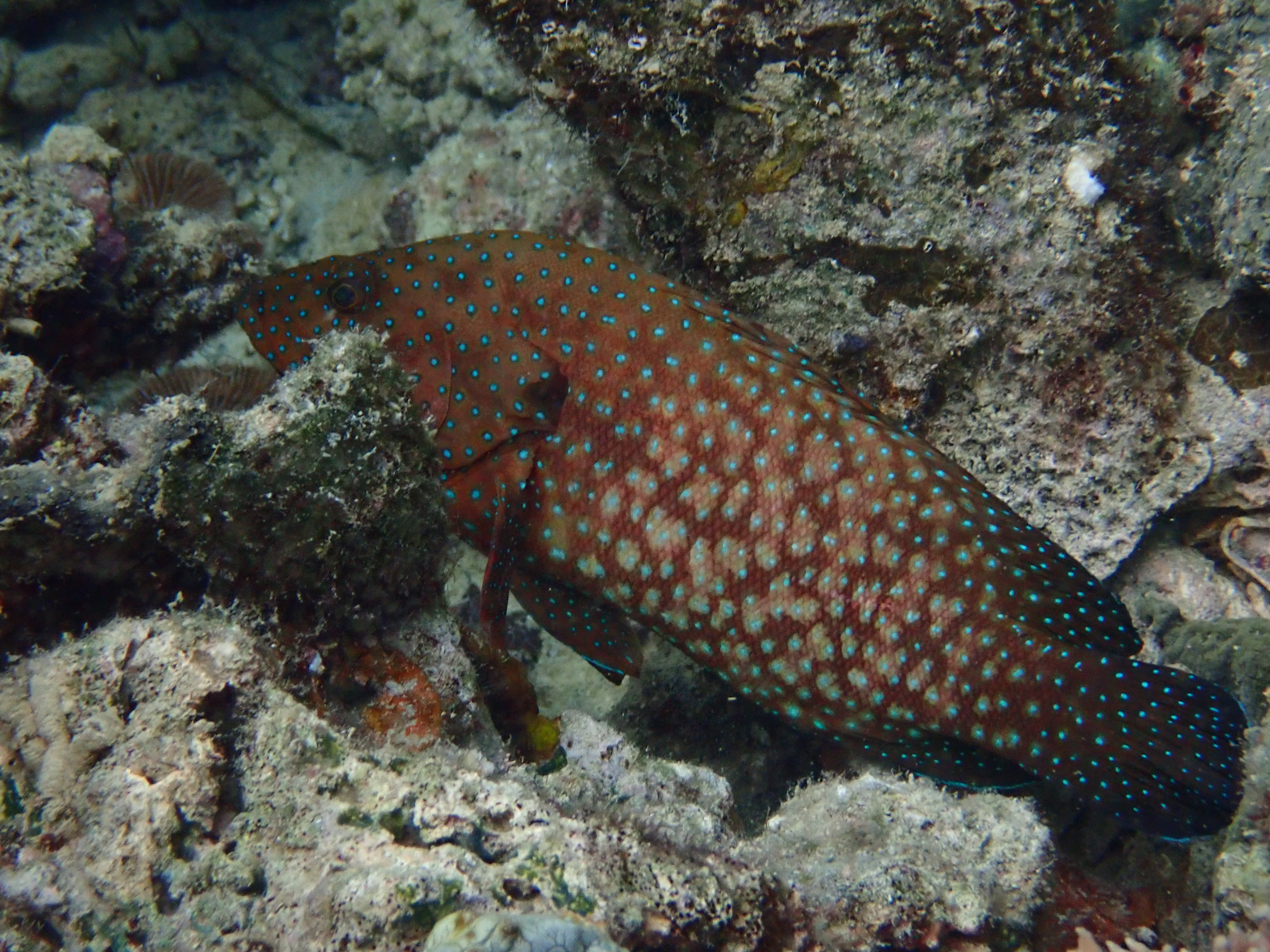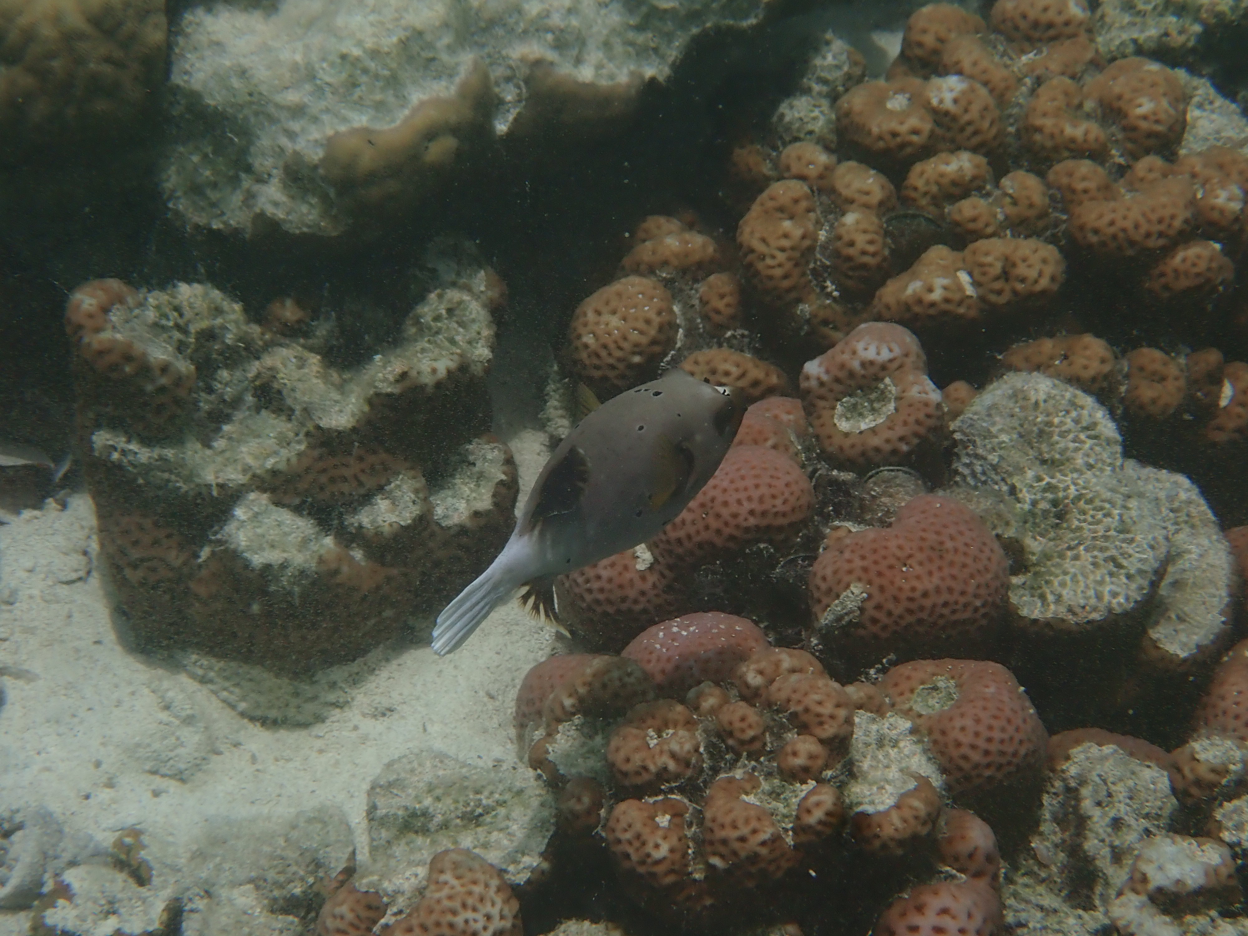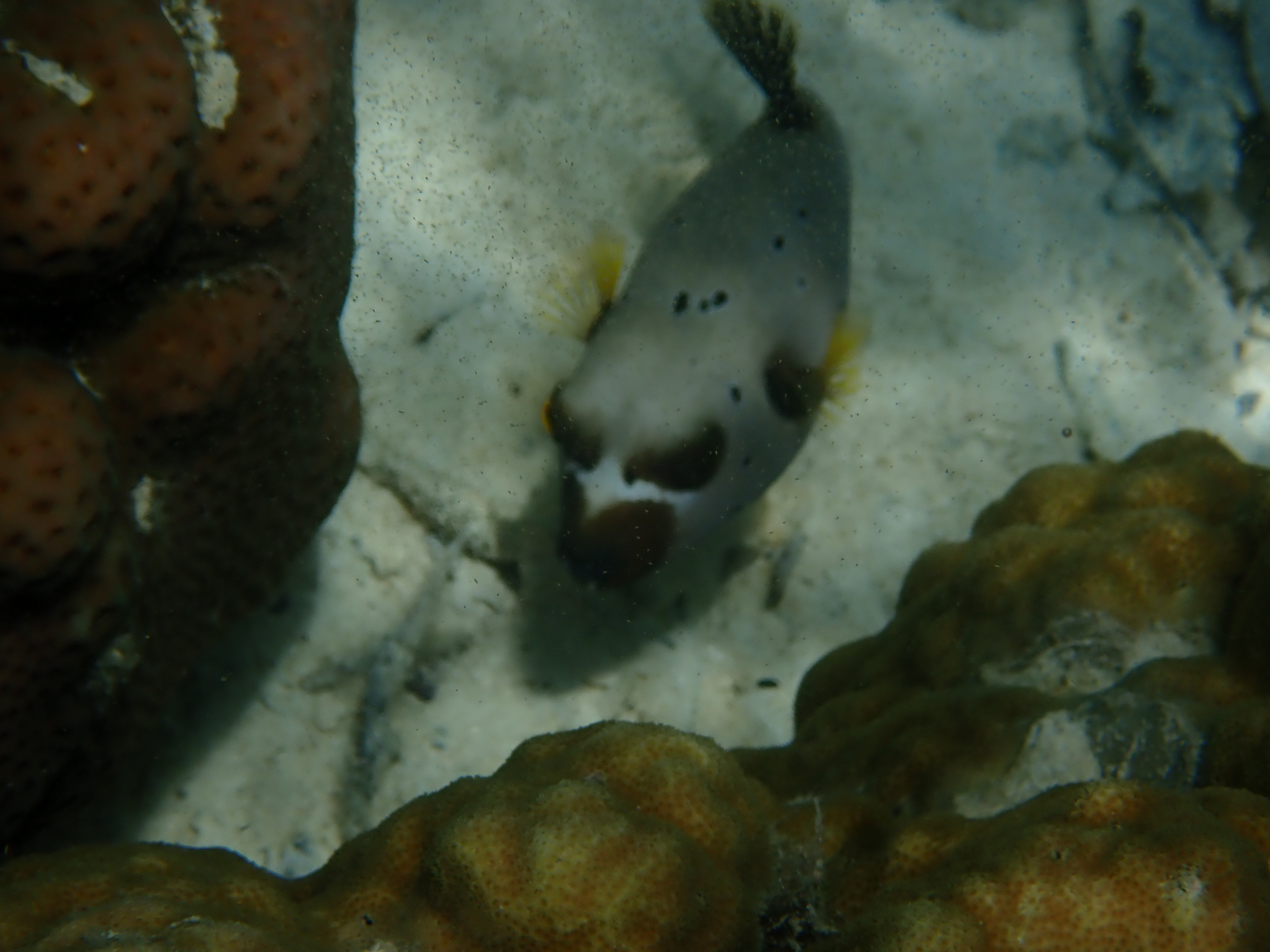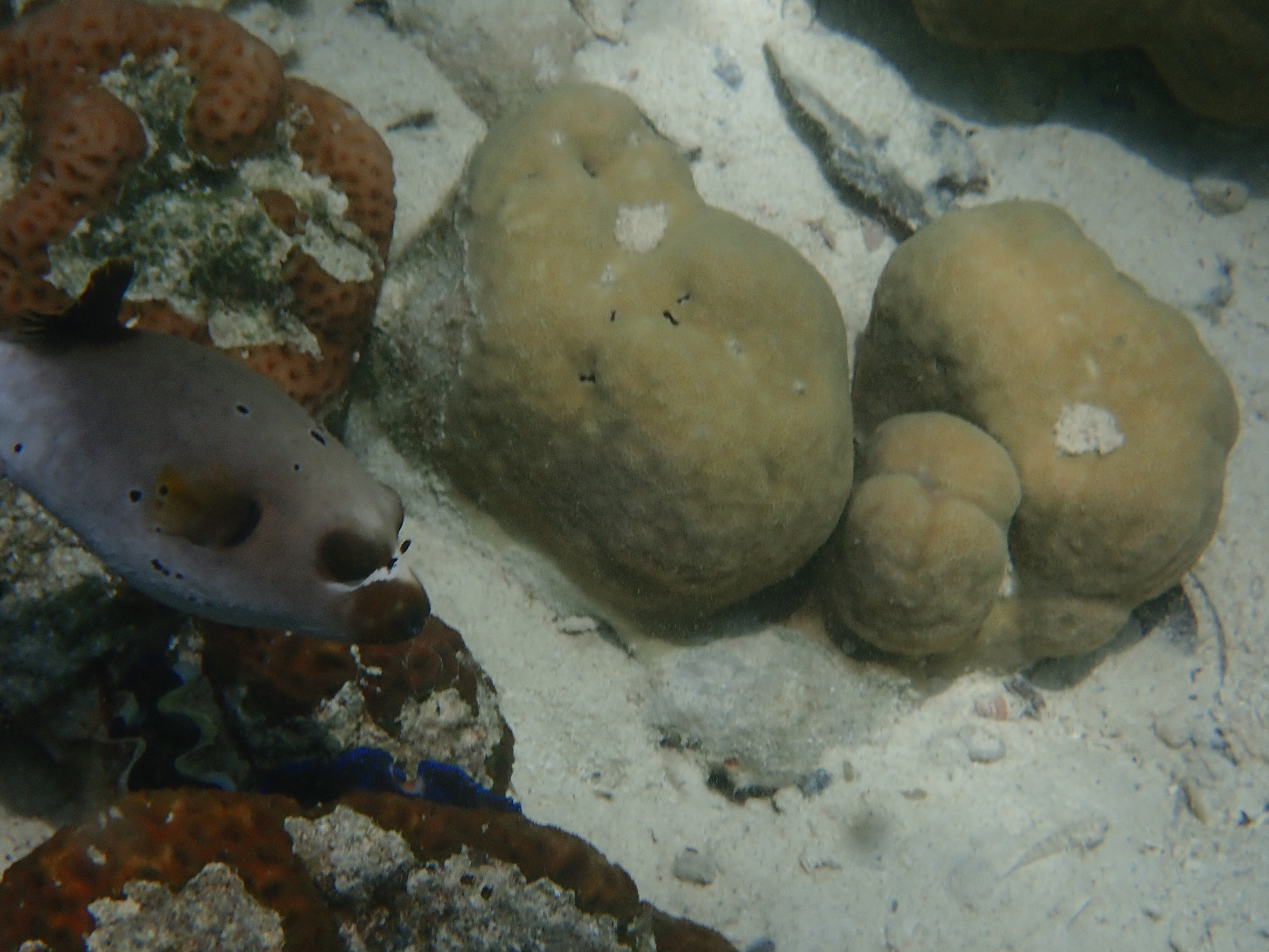 個人的に好きなコクテンフグを発見。ゴマアザラシの様な顔立ちが可愛い魚です。臆病なので近づくと、すぐに珊瑚の中に隠れます。