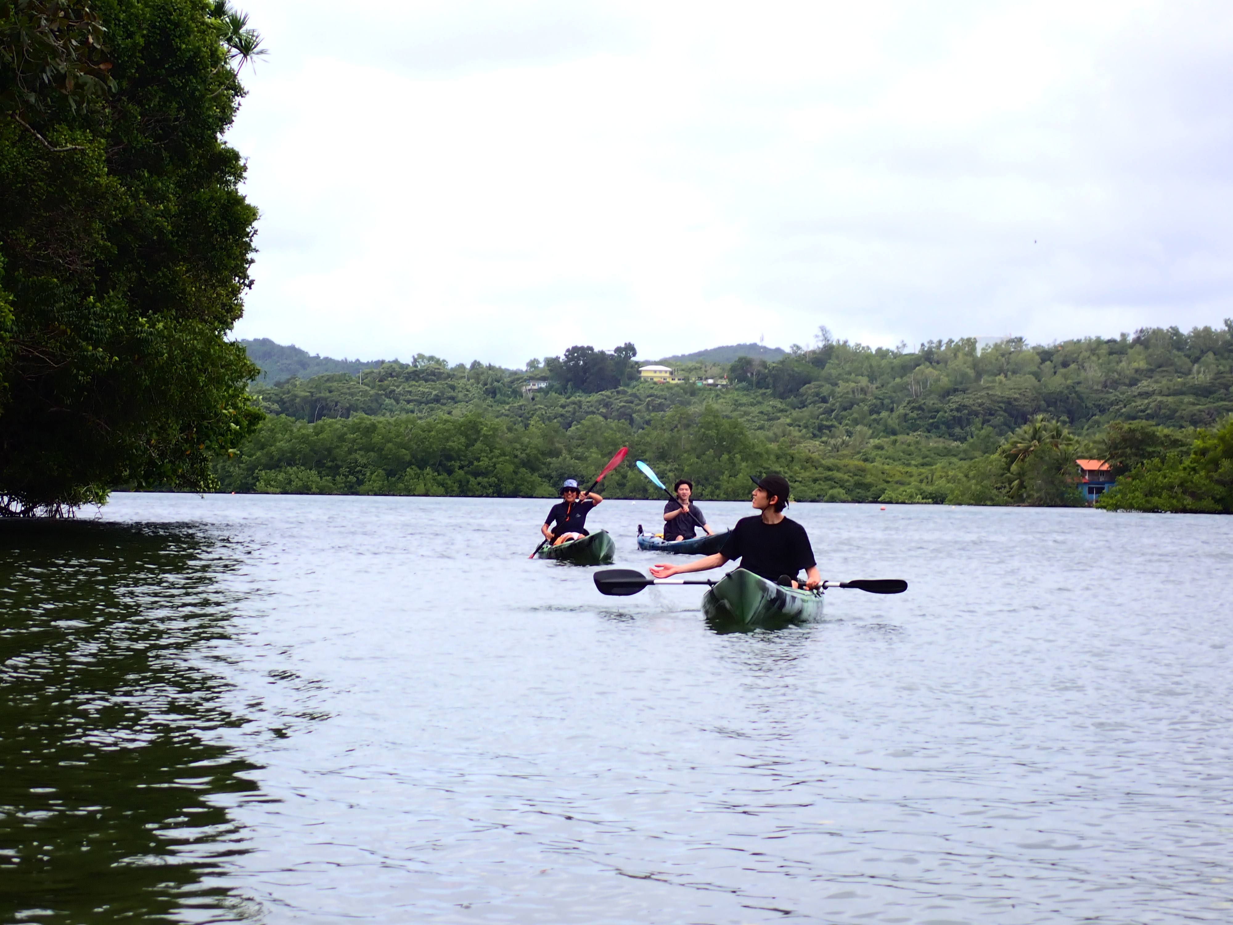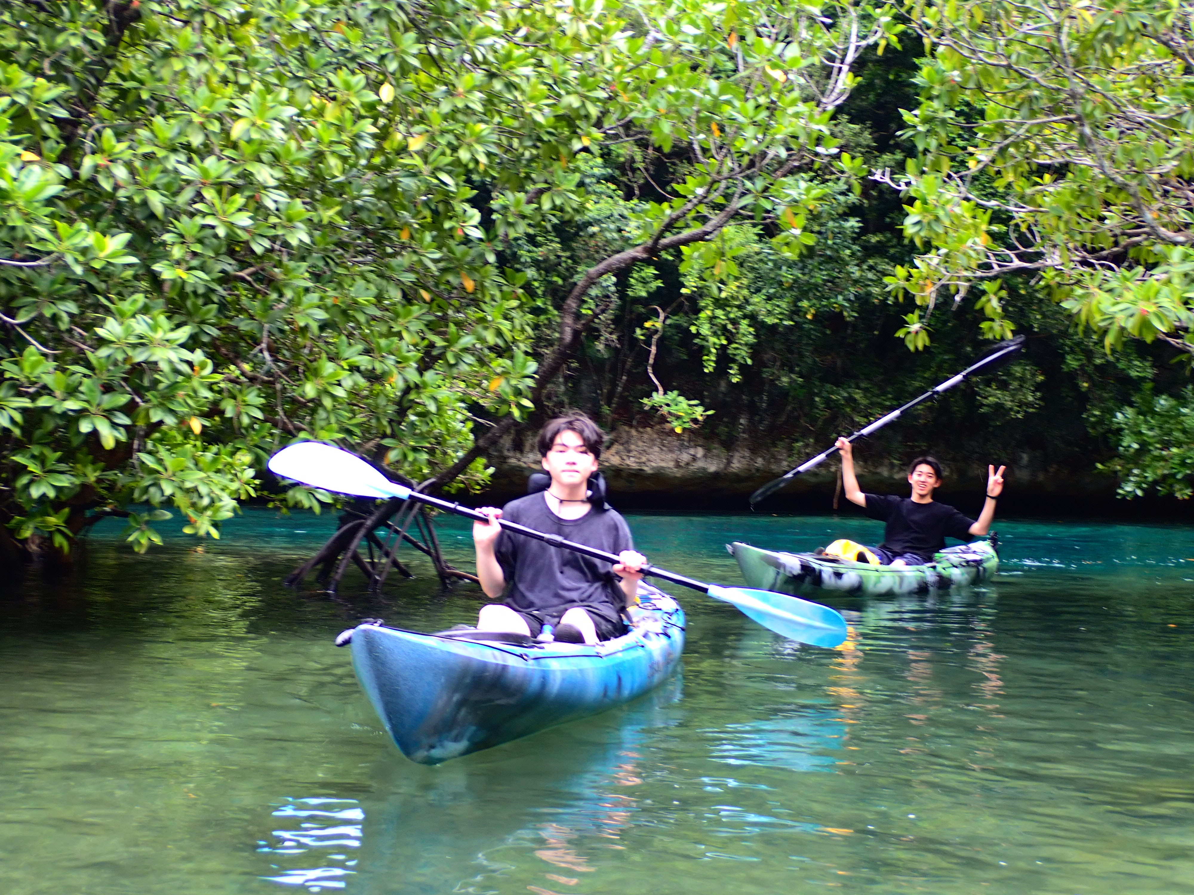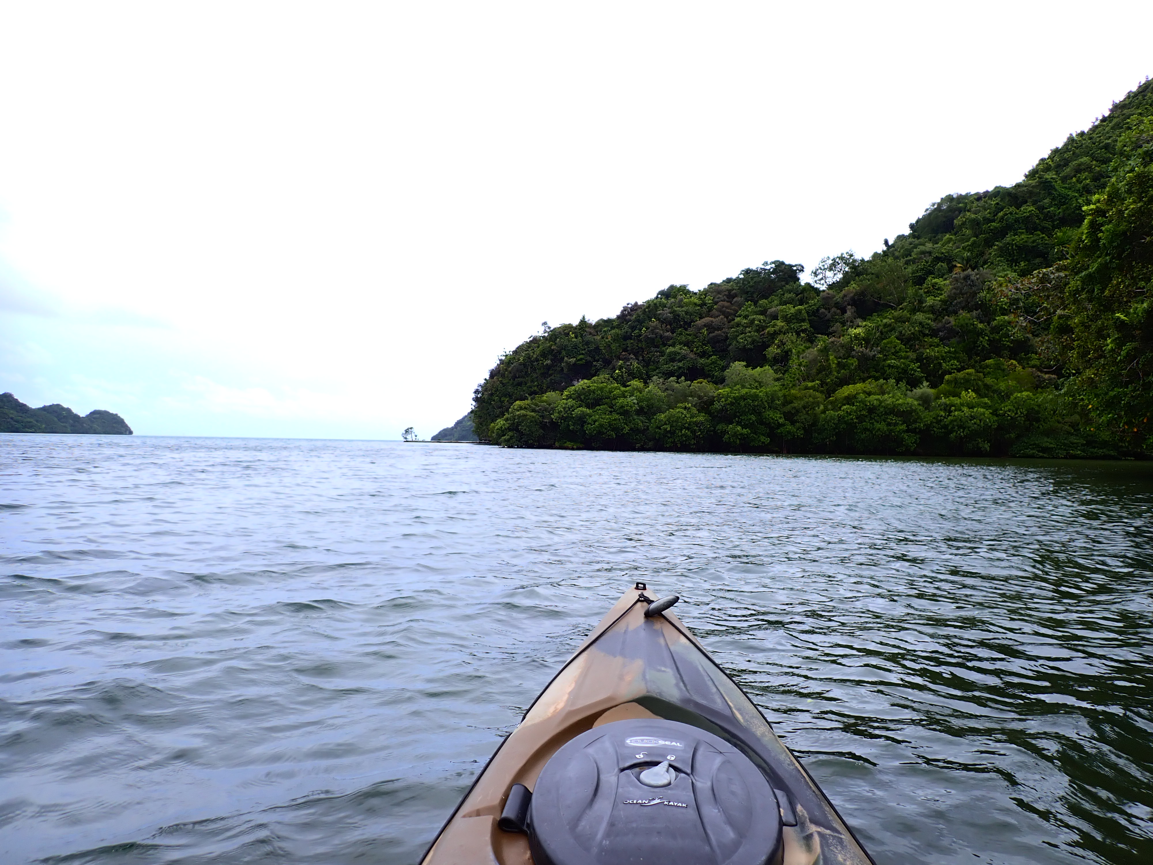 スタート地点は火山島のマングローブ帯の為、泥があるので濁り気味ですが、水路を抜けて珊瑚島に差し掛かると、急に海の透明度が良くなります。ロックアイランドに沿って、漕ぐのは心地よい一時です。