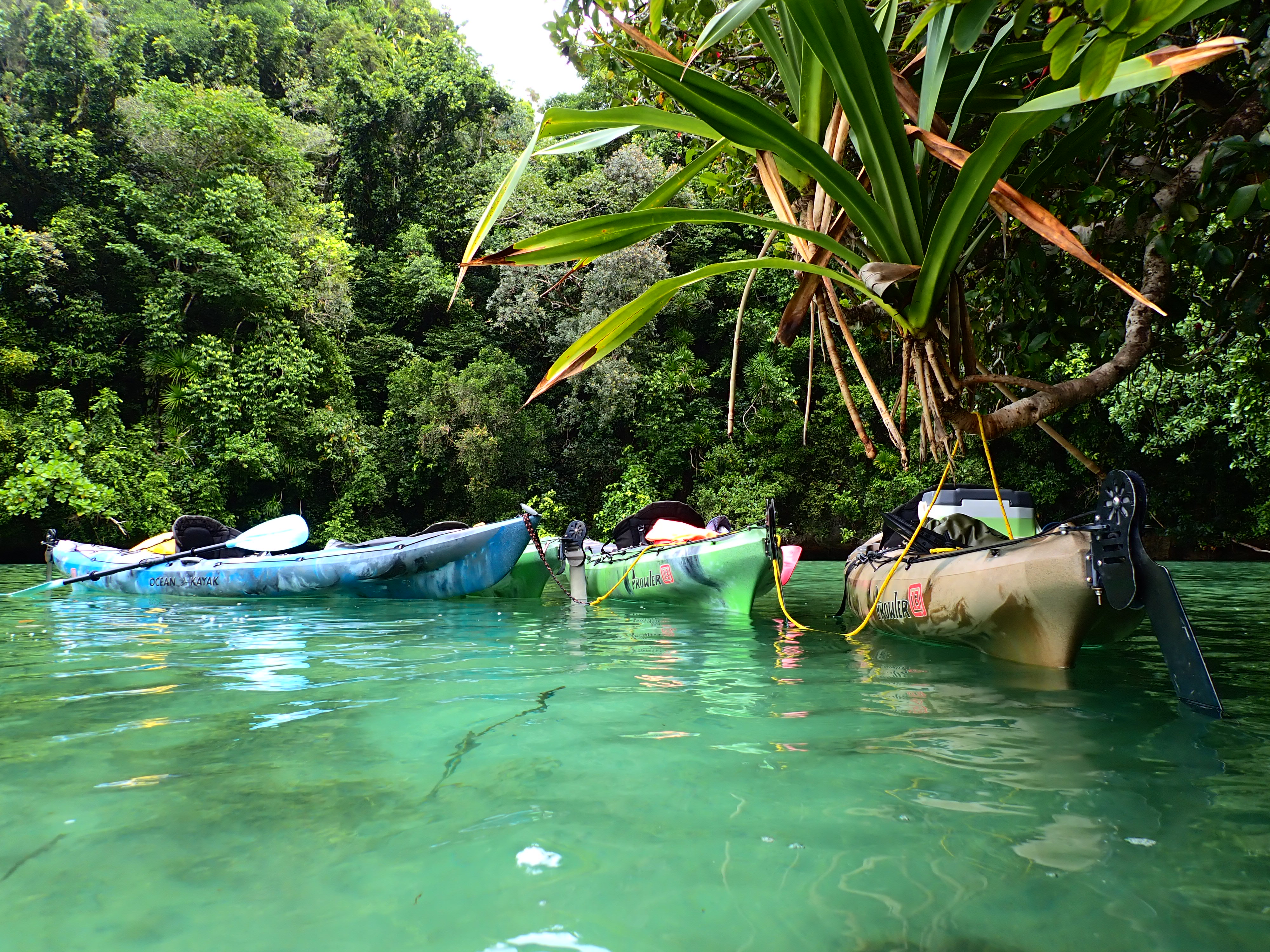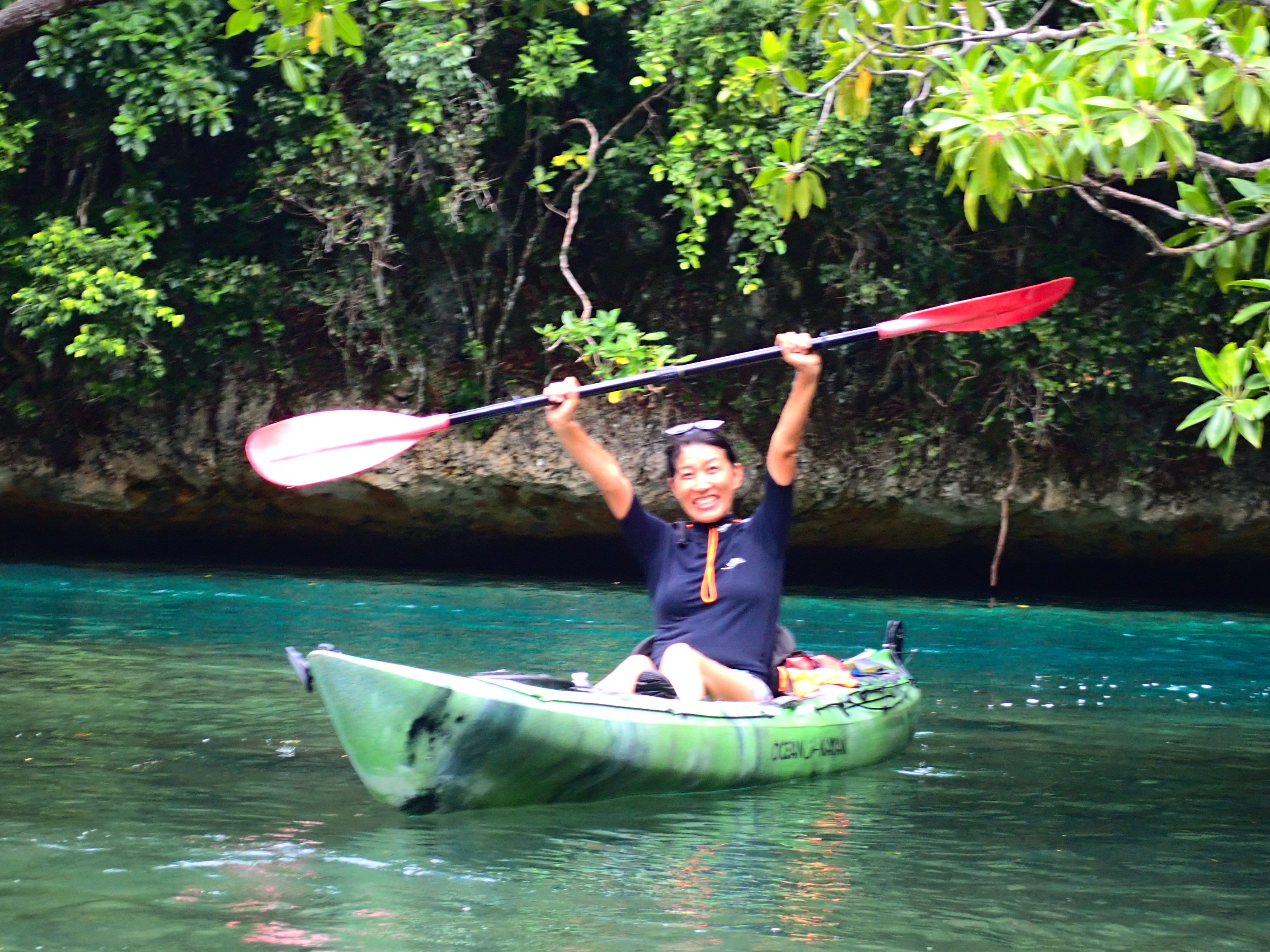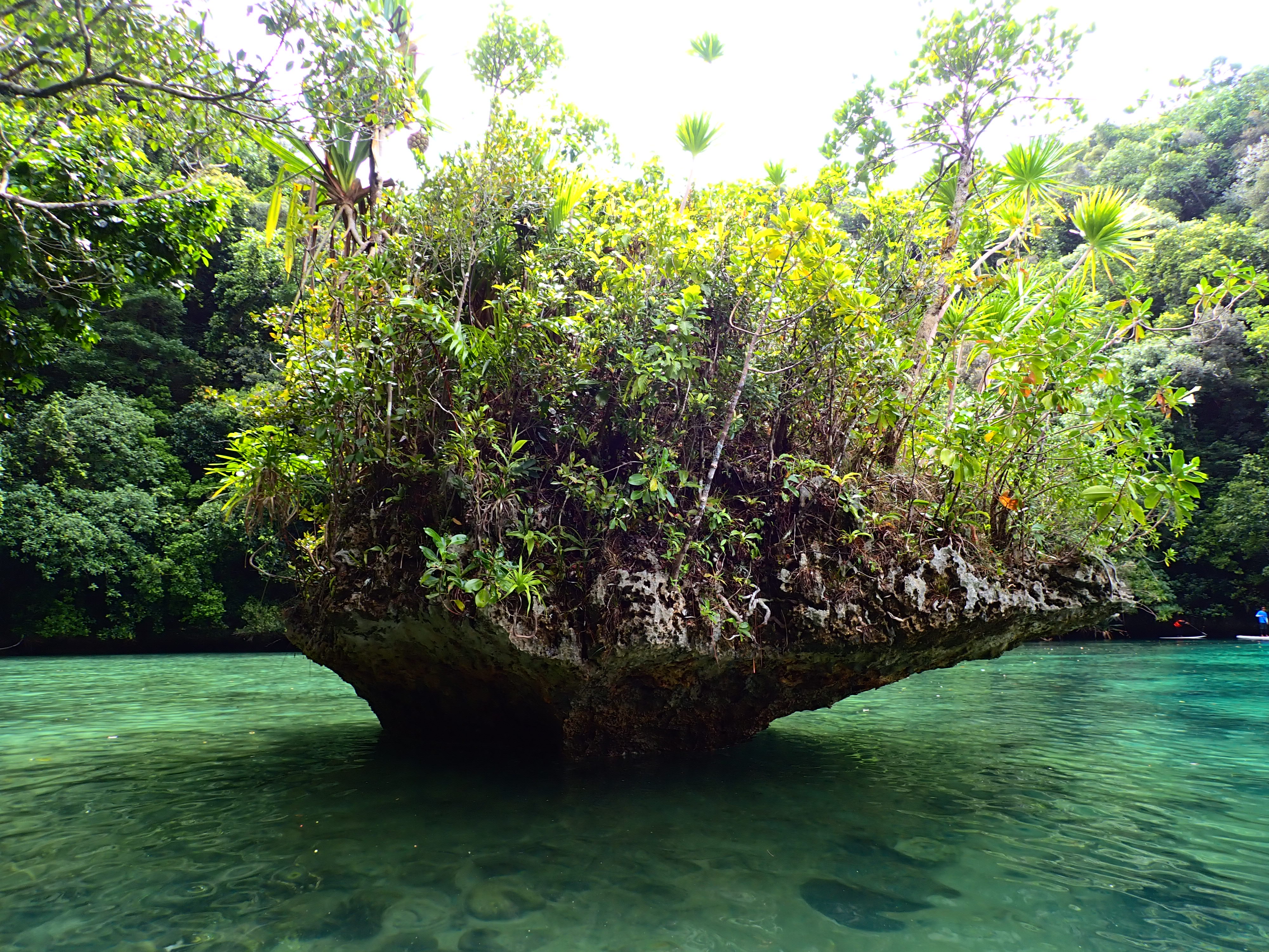 スタート地点は火山島のマングローブ帯の為、泥があるので濁り気味ですが、水路を抜けて珊瑚島に差し掛かると、急に海の透明度が良くなります。ロックアイランドに沿って、漕ぐのは心地よい一時です。