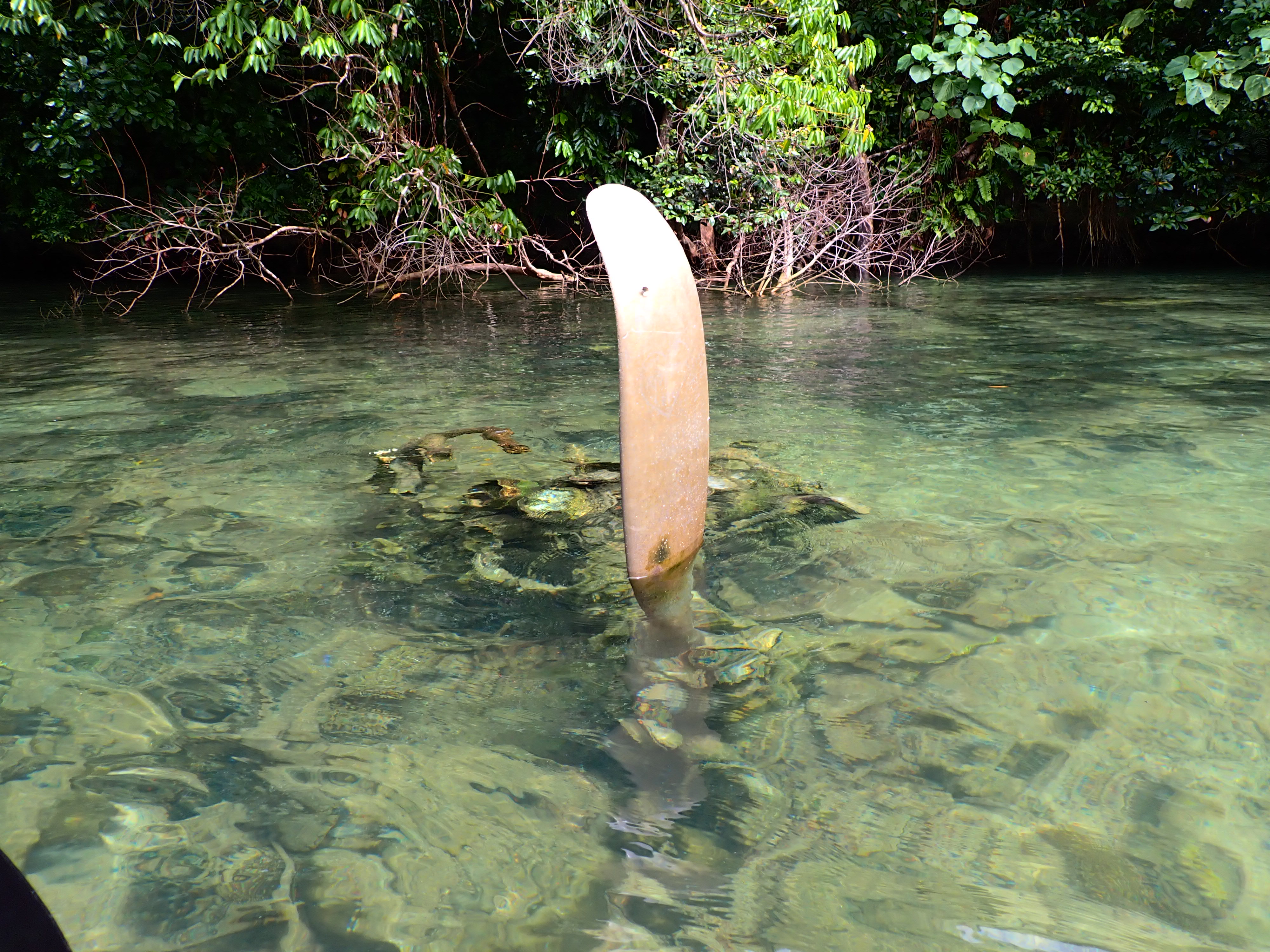 カヤックを木に繋いで、スノーケルで海に沈んだ水上偵察機を見に行きました。少々濁りがありましたが、水中で見る方がよりはっきりと観察出来ます。機体には珊瑚が付着しており、今は魚達の隠れ家にもなっています。