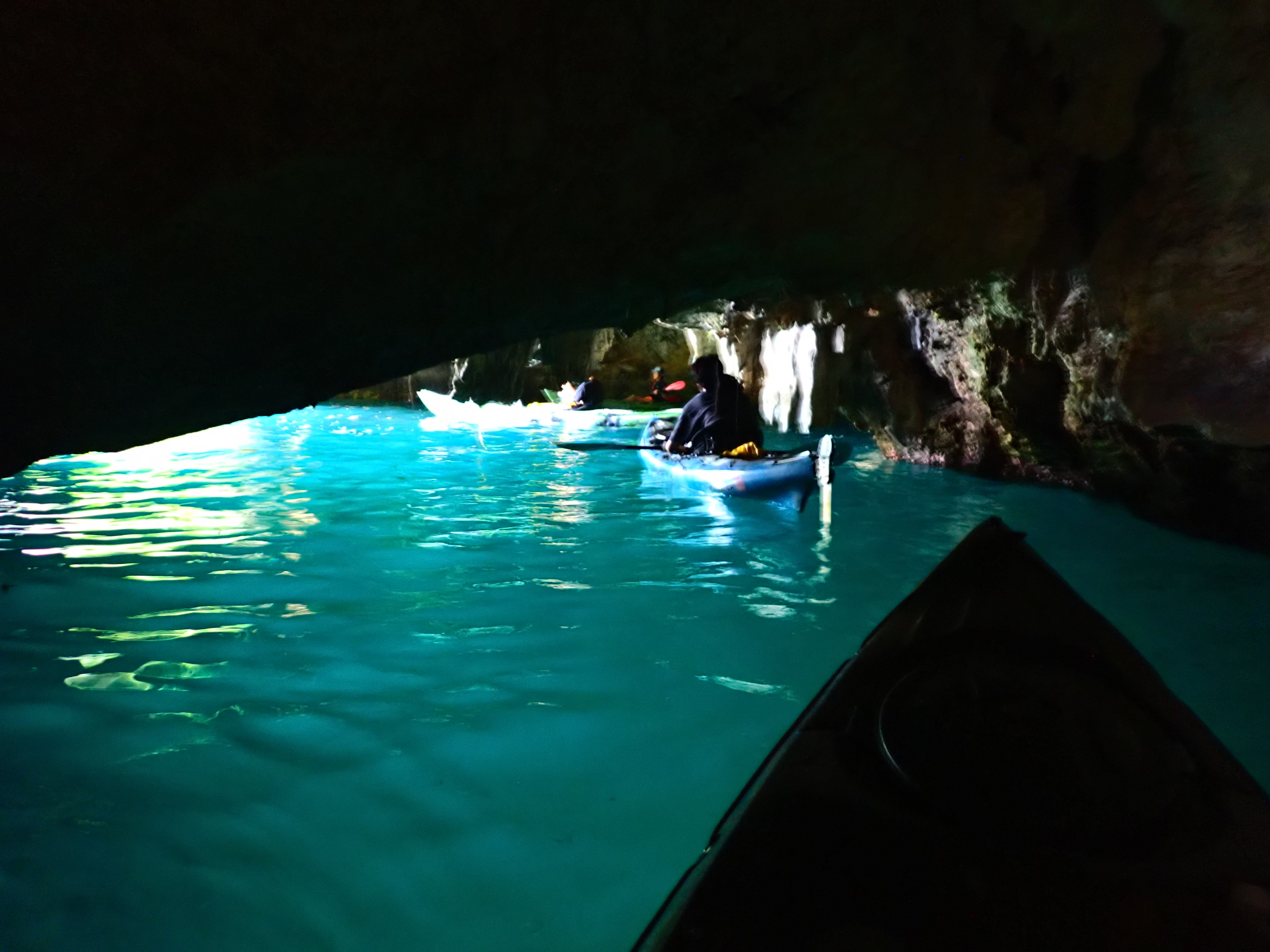 次に訪れたのは通称、青の洞窟。本日は南風の為、洞窟内に少し波が入り込んでおり、なかなか写真のピントが合いませんでしたm(__)m晴れた日はもう少し、淡い青色になることも。洞窟の奥の方はカヤックでぎりぎり入れるスペースがあり、探検気分を楽しみました。