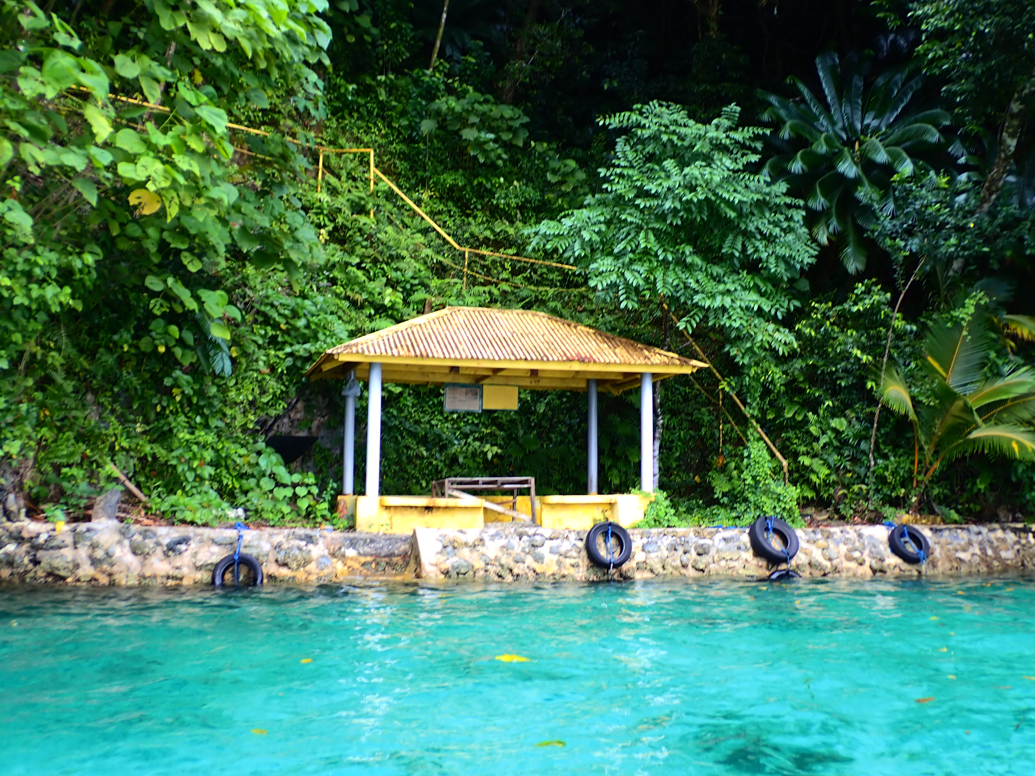 マングローブを抜けると大きな洞窟が見えてきます。ここは格納庫洞窟と呼ばれており、戦時中に水上偵察機の格納場所として使われていました。洞窟の奥から見る景色がとても綺麗です。