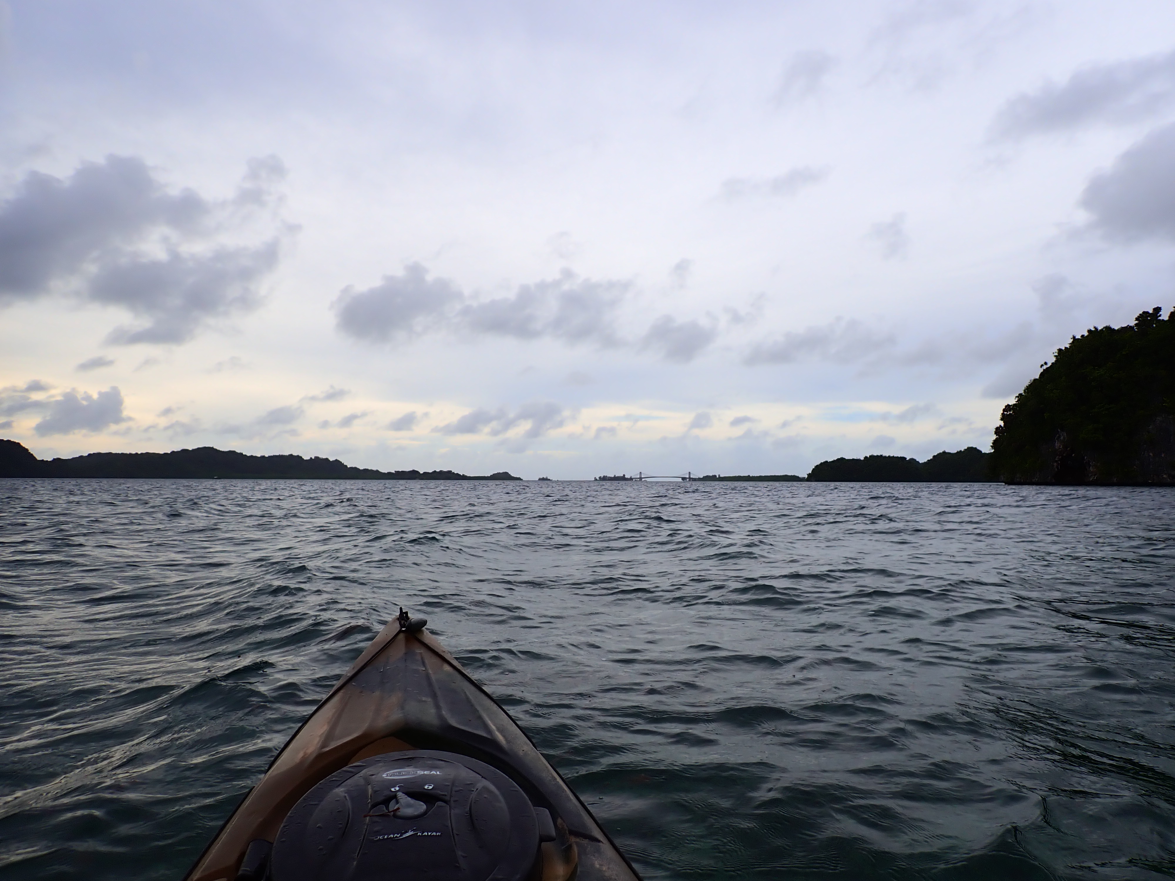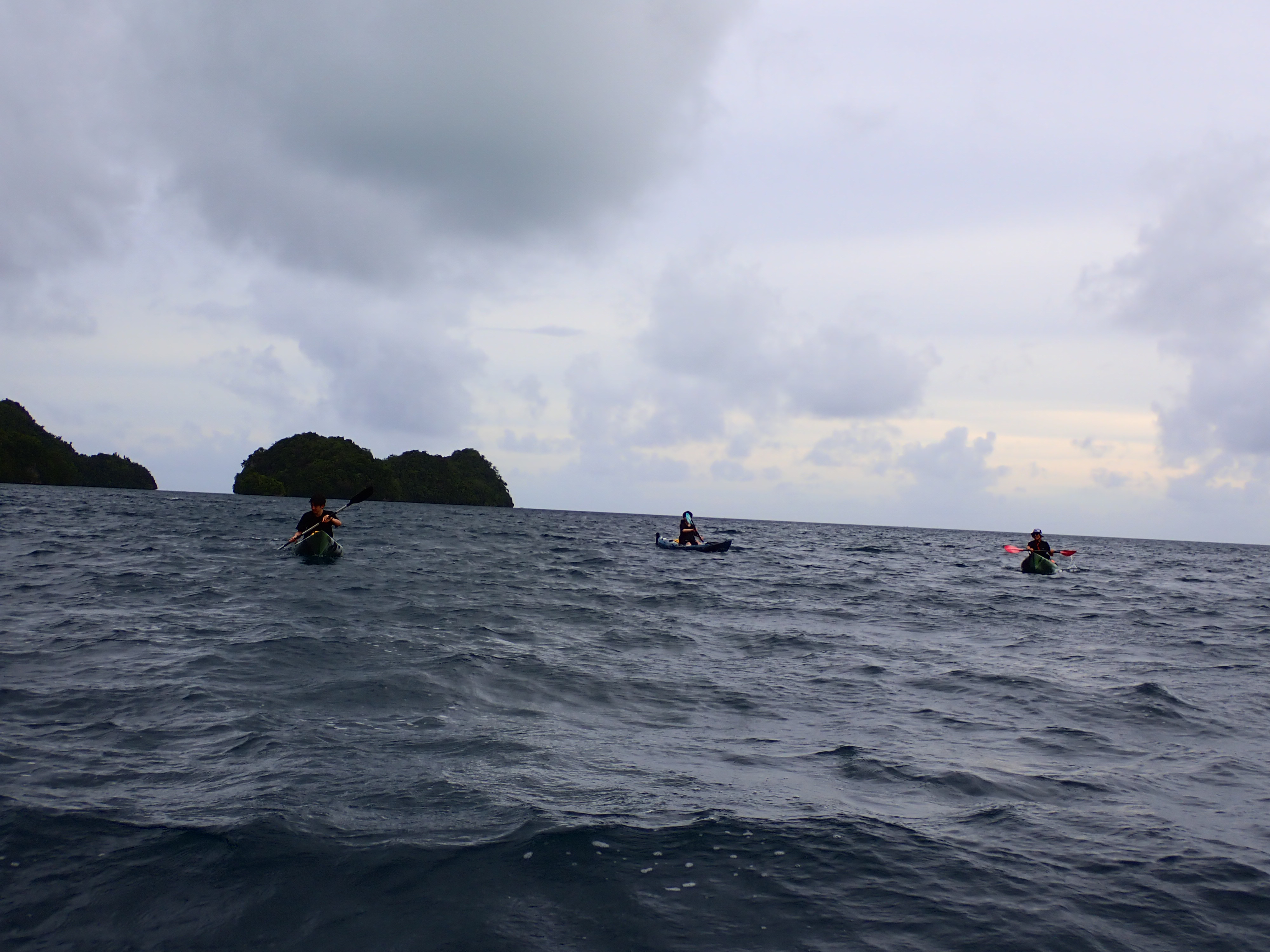 本日はアイライ州のストーンマネーアイランドまでパドリング。先ずは港でパドリングレッスンをしてから出艇。天気は少々曇り、風は南風、スタート地点は穏やかな漕ぎ出しでした。