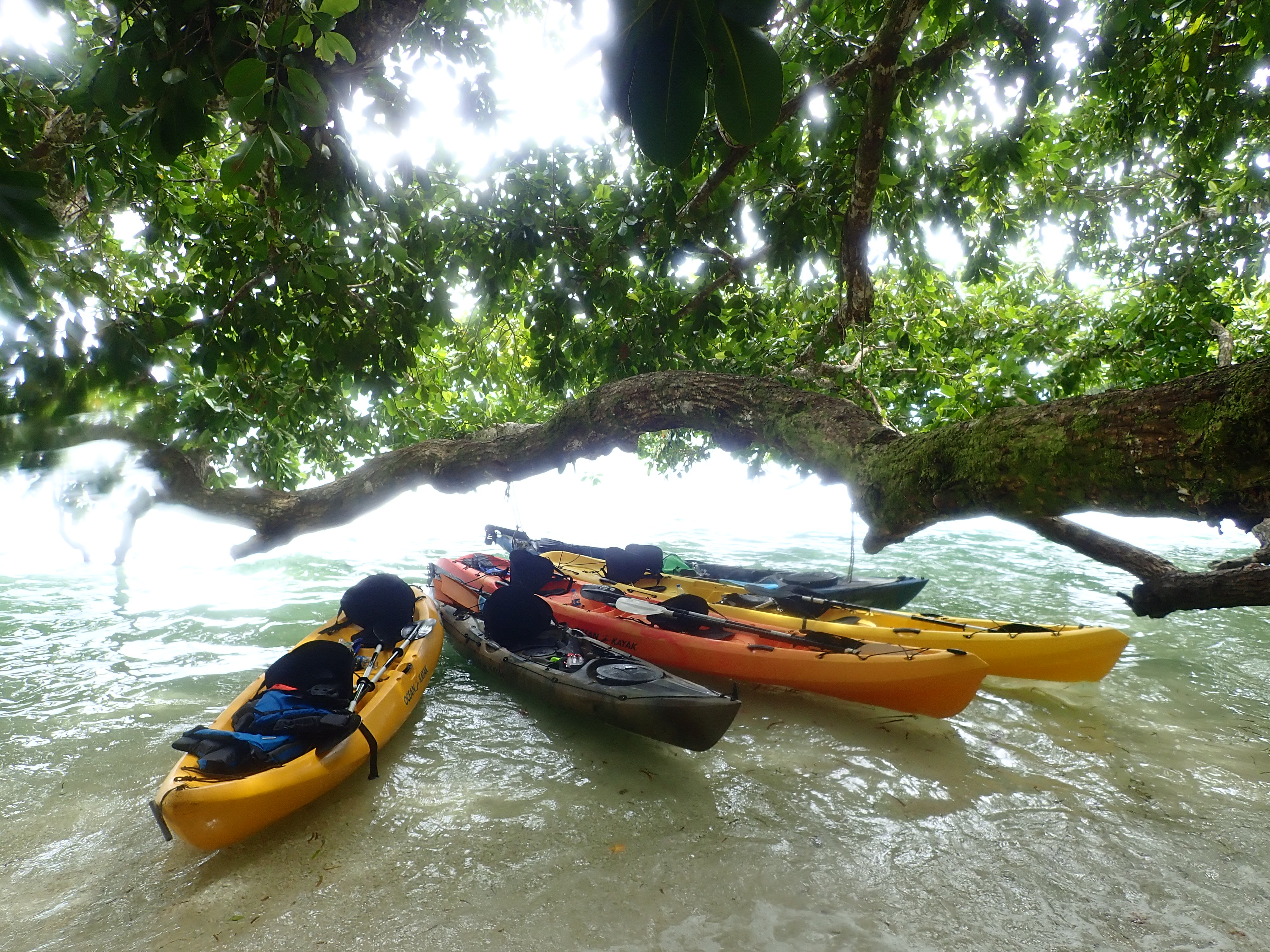 After paddling lesson on land, start kayaking.Rock Island’s shallow water is crystal clear and can see coral and fish from above the kayak.