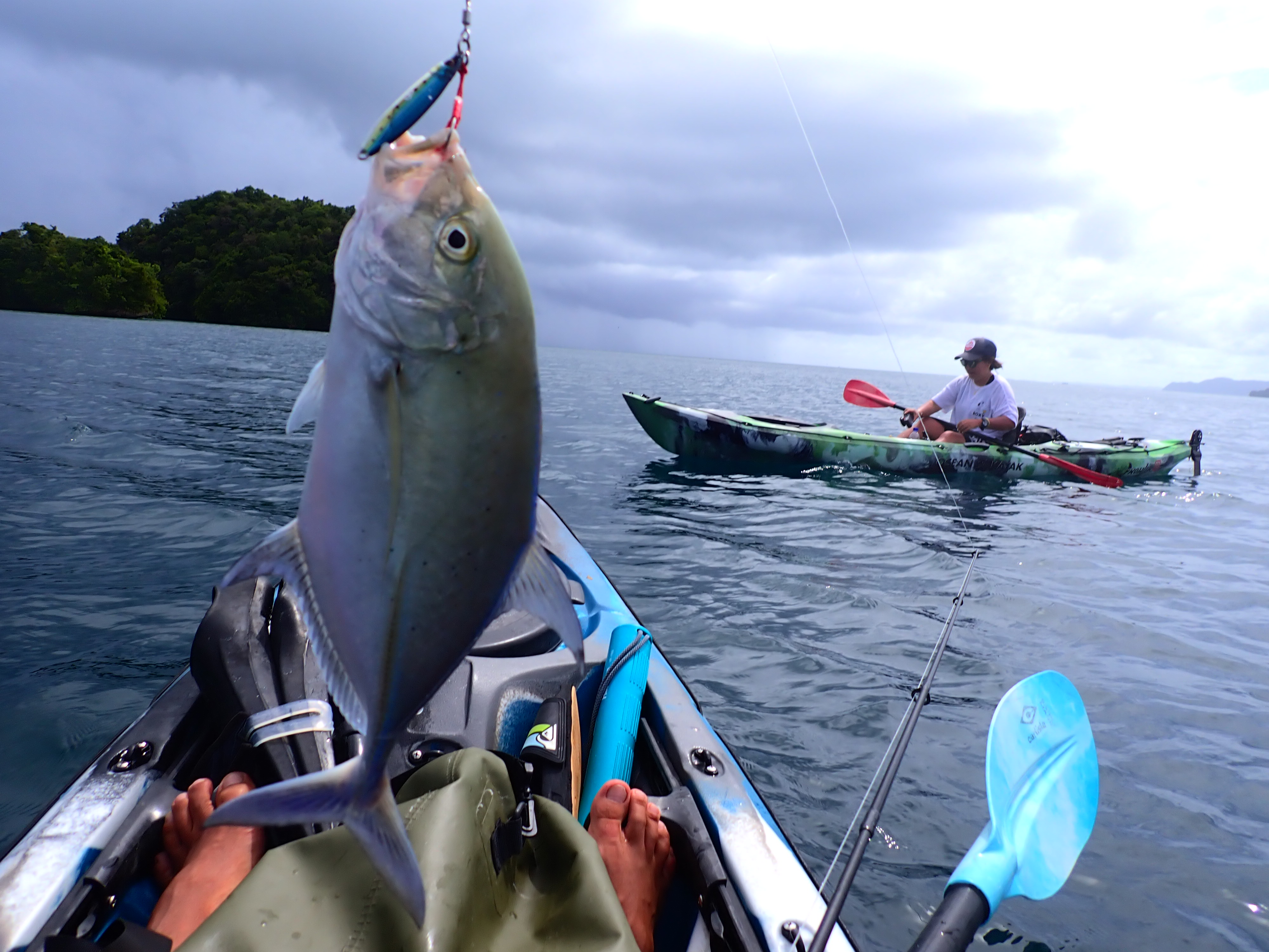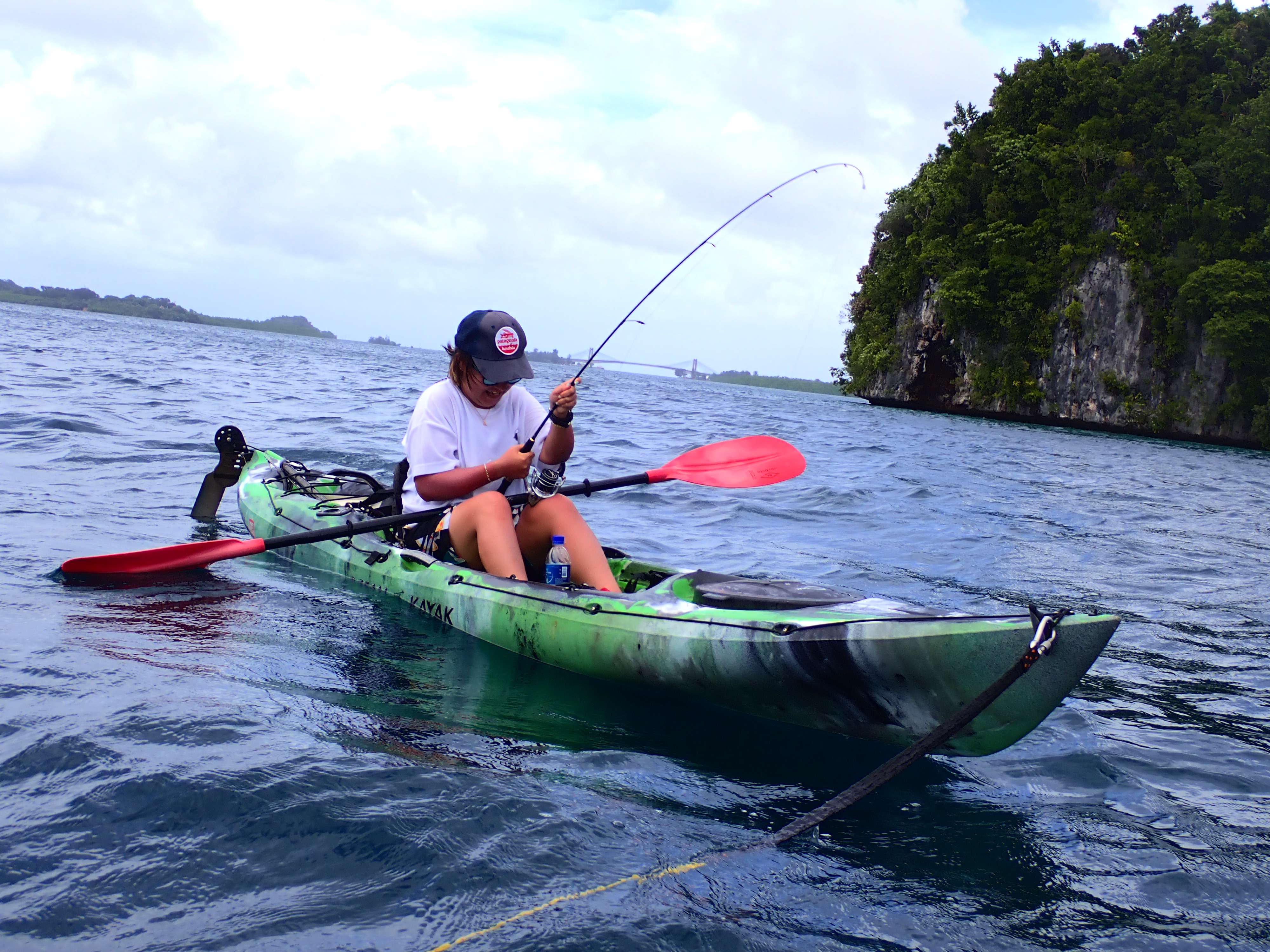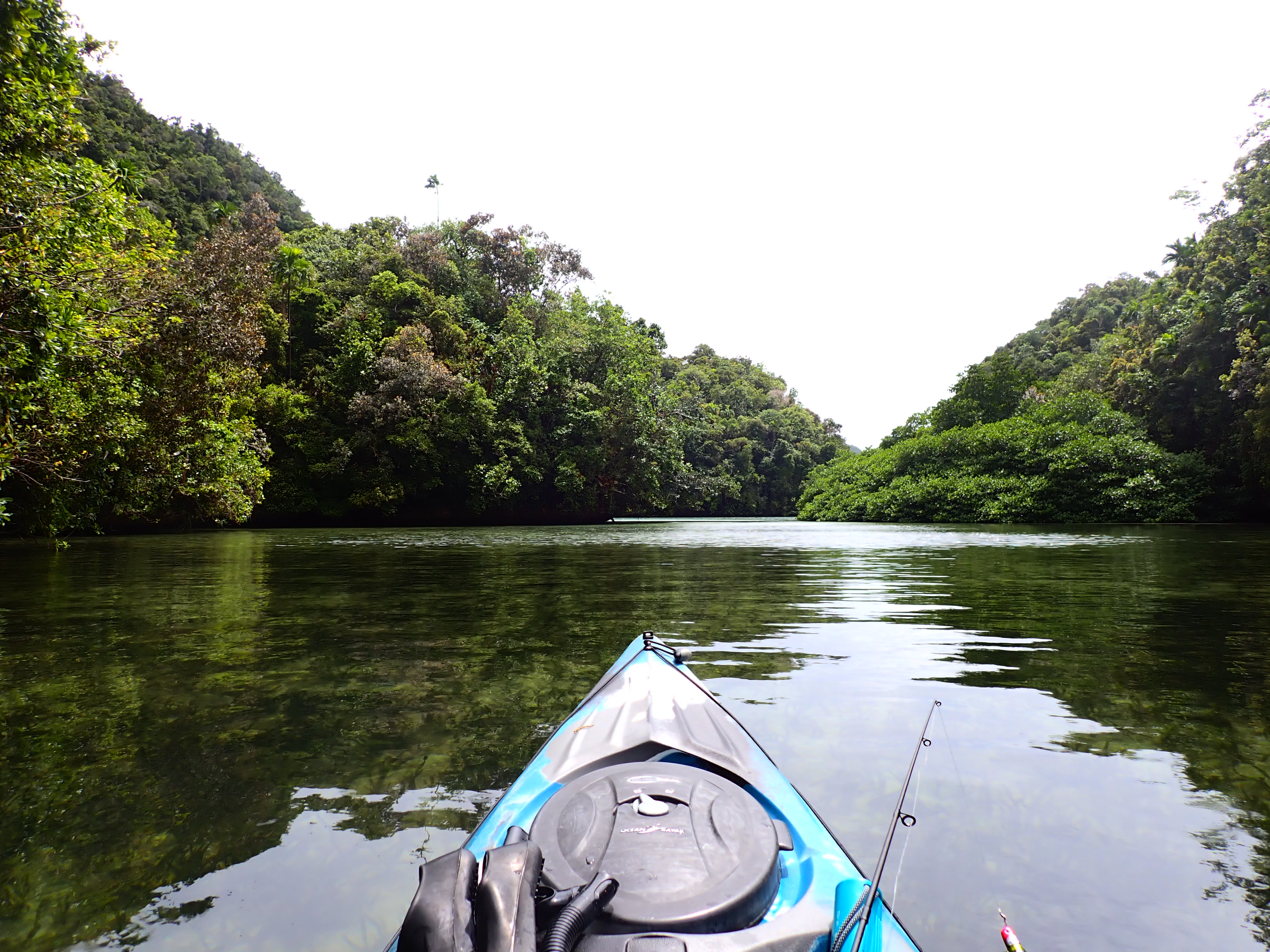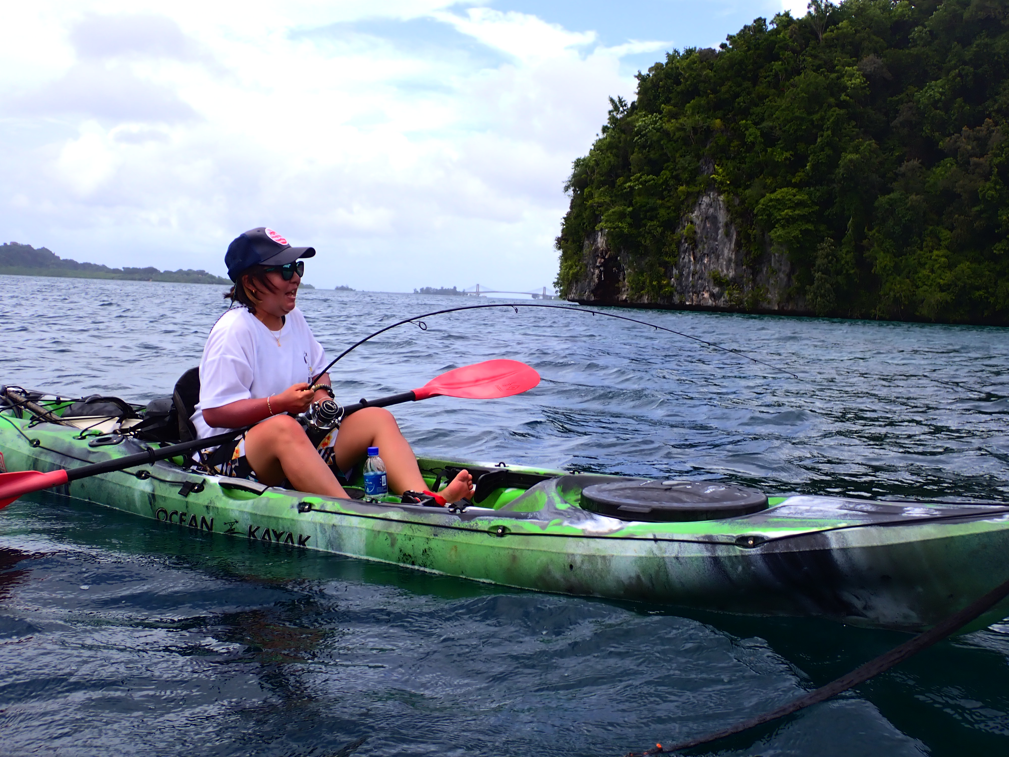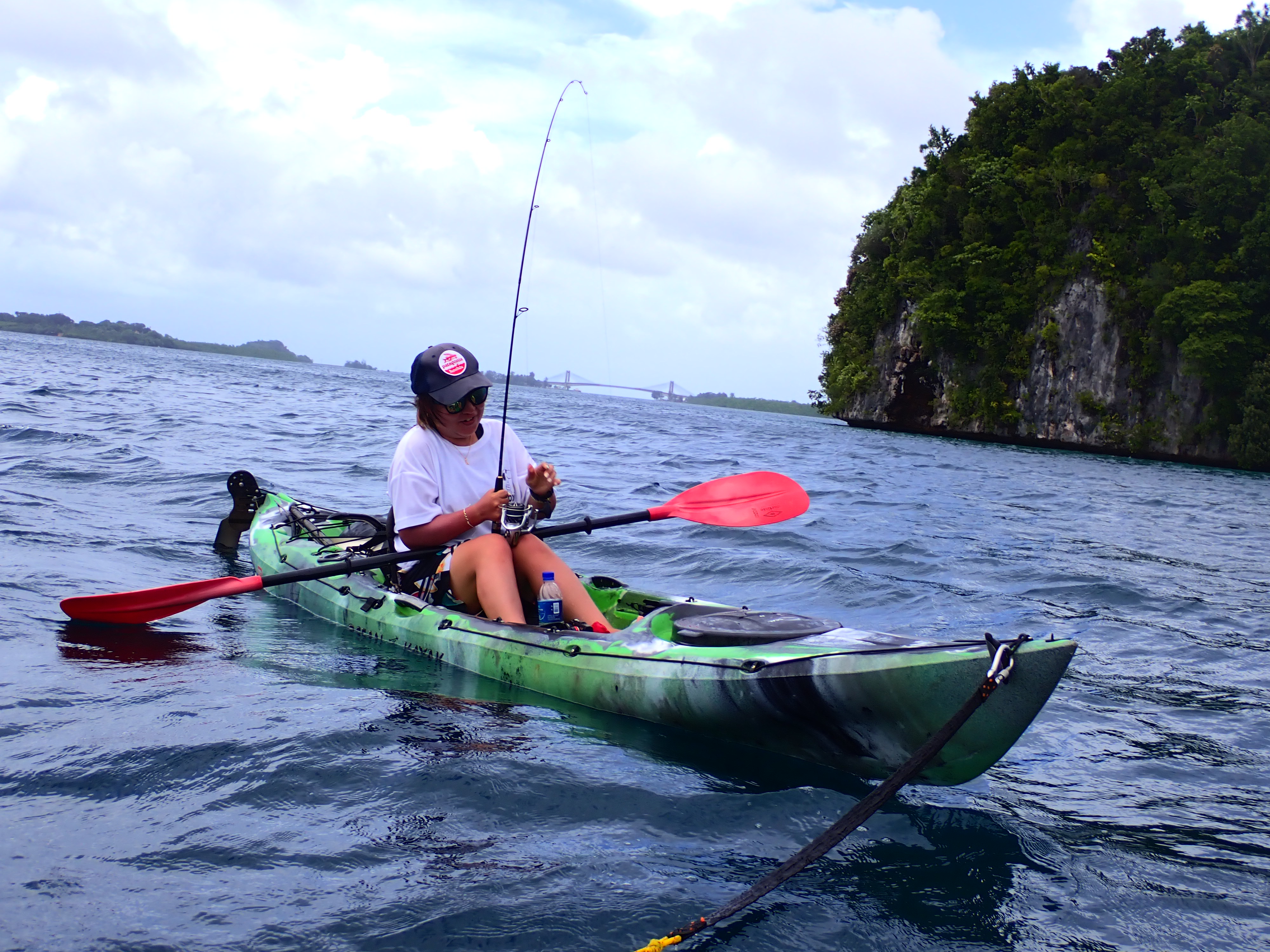 今日は内湾で軽ーく釣り&カヤックしようという予定だったので、ロッドもリールも小さめ。ただ、そんな事はお魚達には関係ないので、たまにオーバースペックなのが掛かると大変な事になるのがパラオのカヤックフィッシングです。