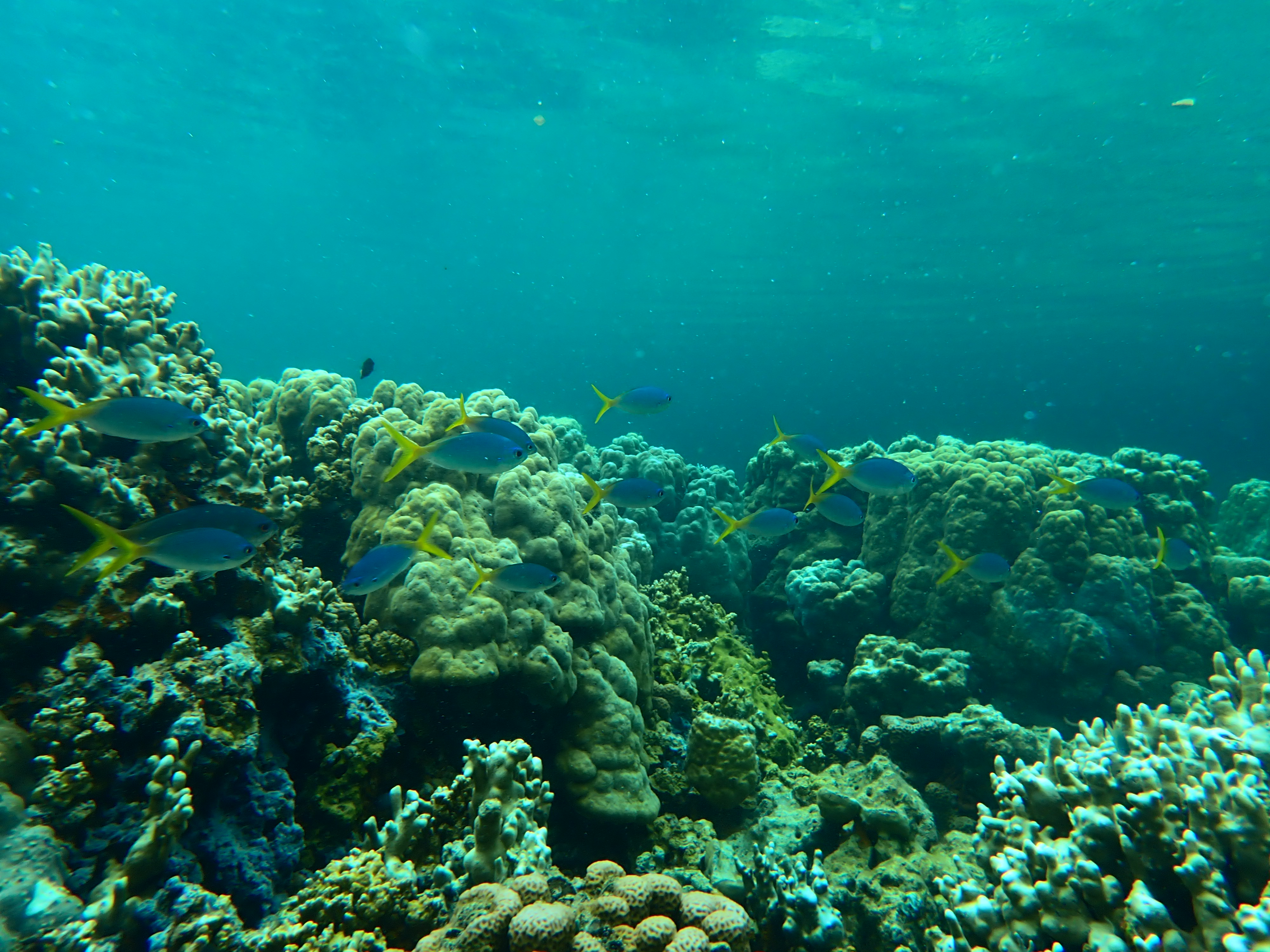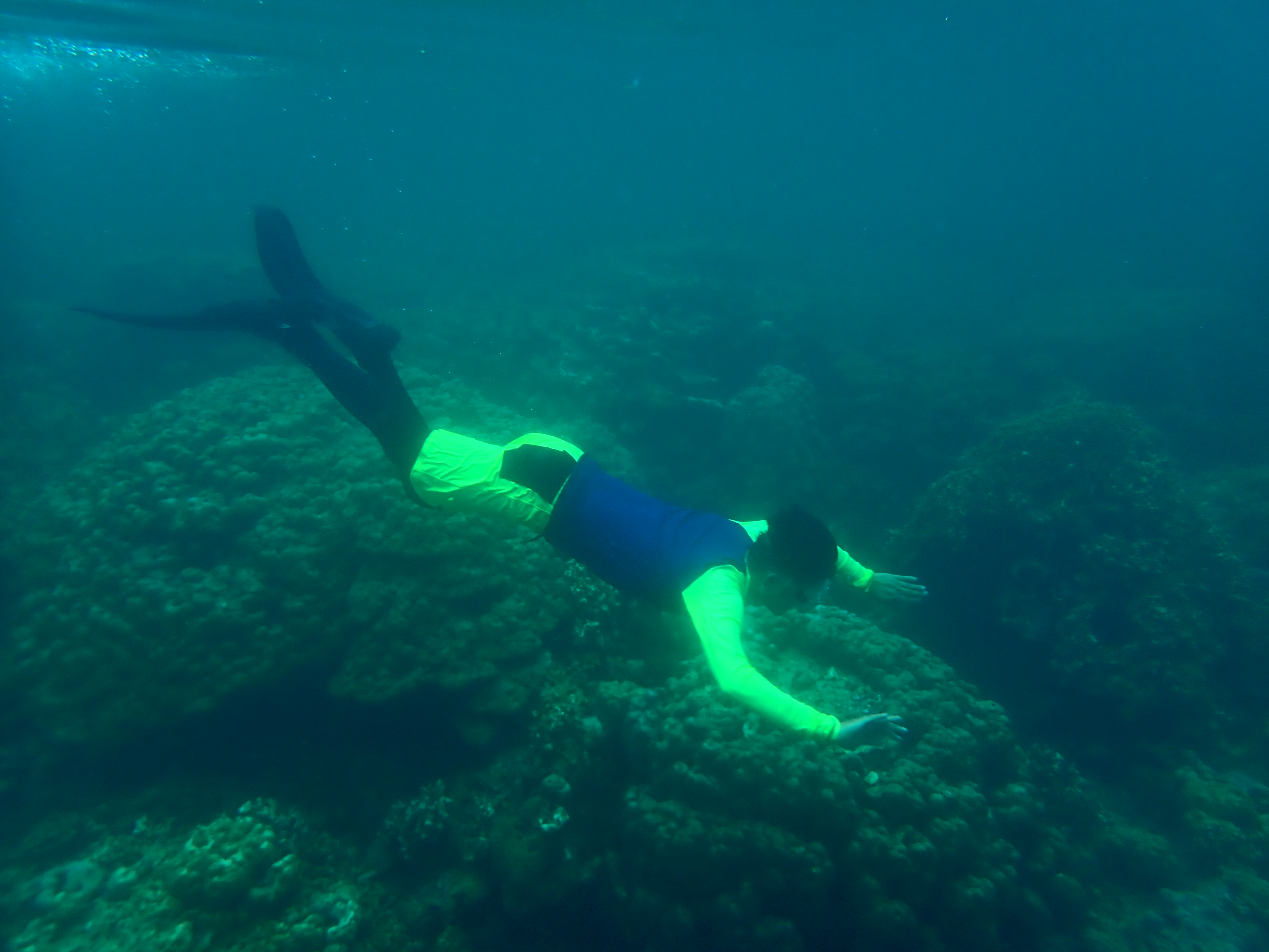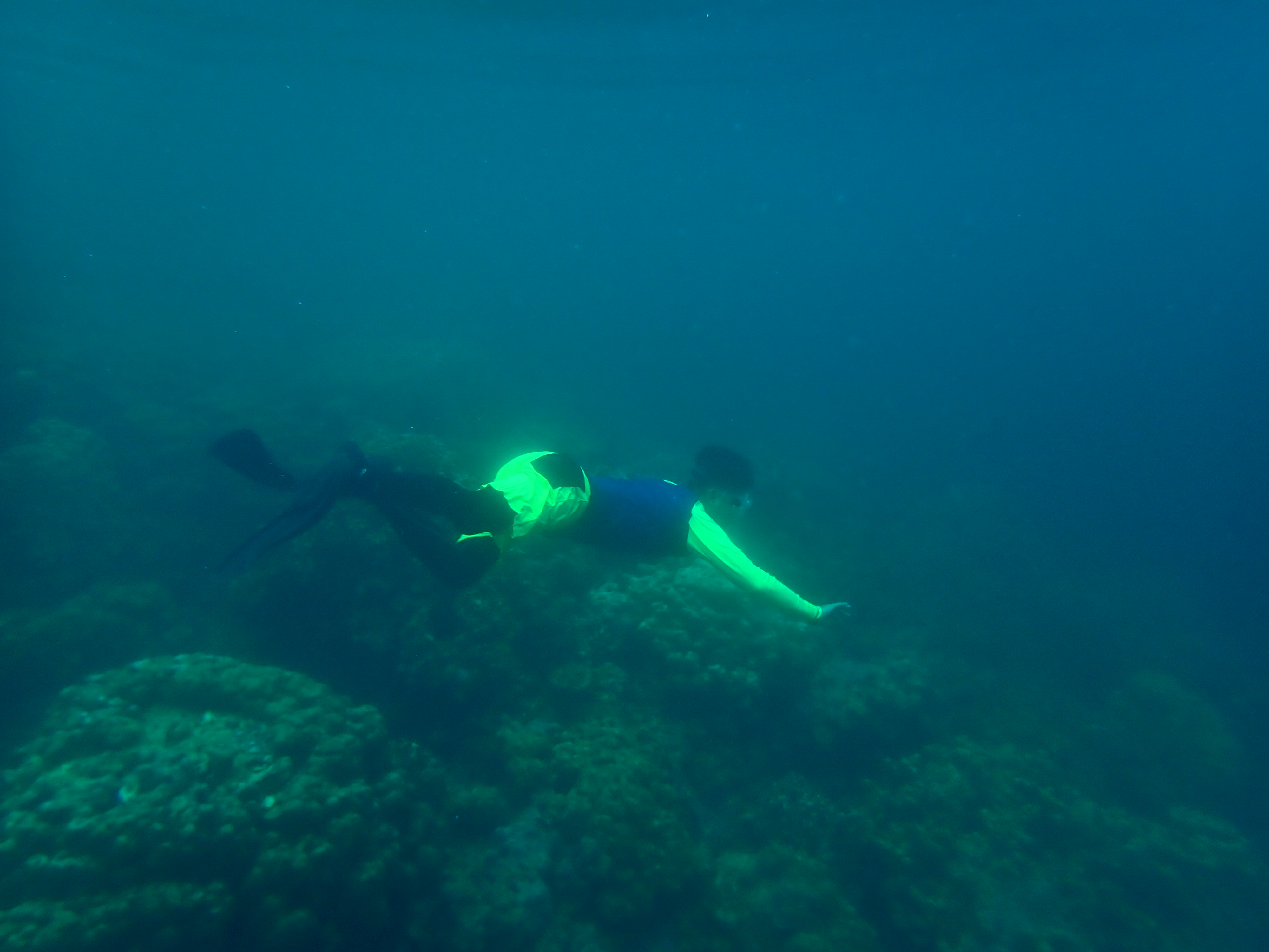 Snorkel time with kayaks tied to a floating dock near the harbor. As expected, the two women were tired and took a short break. He and I enjoyed snorkeling for a while.