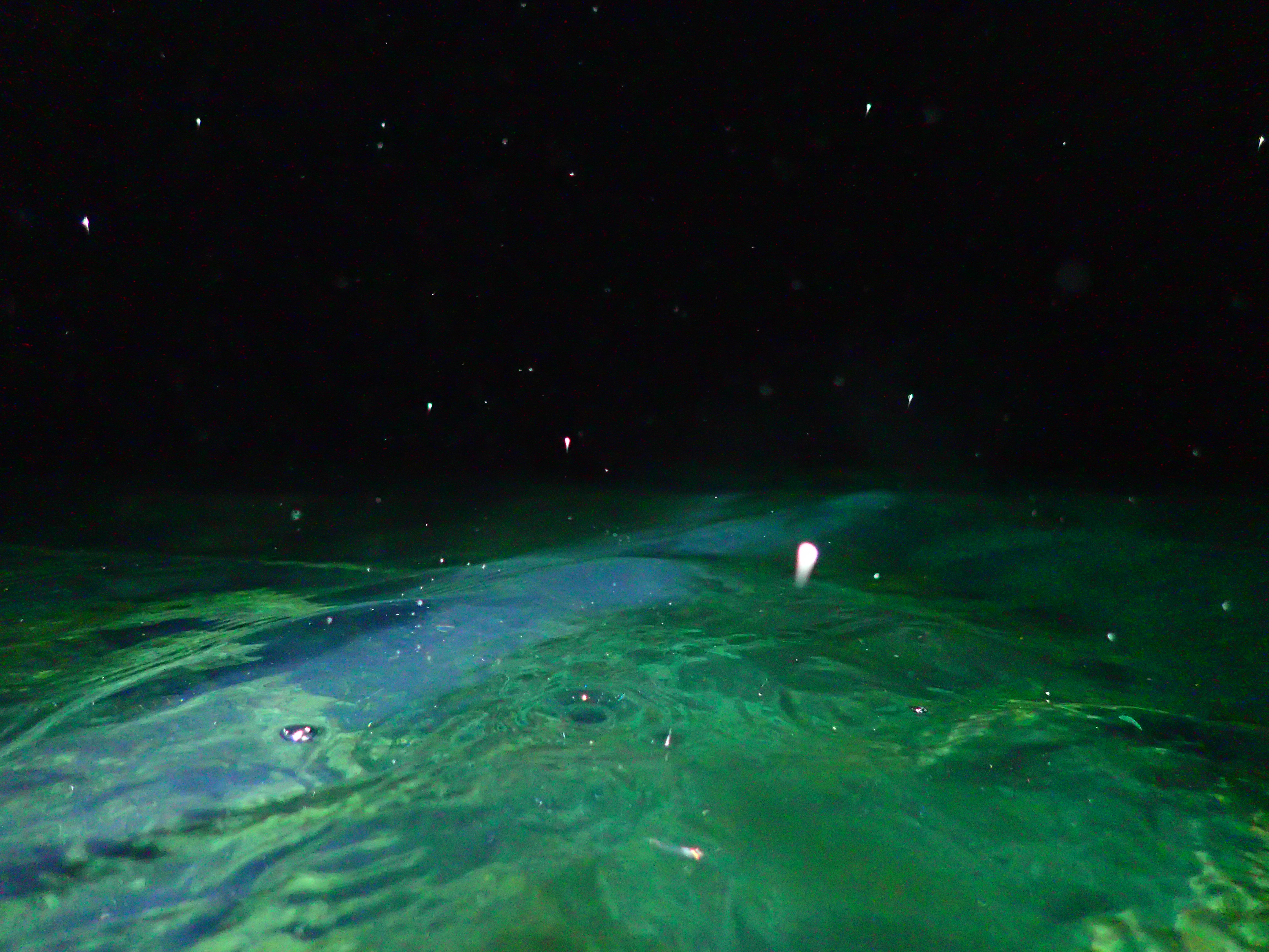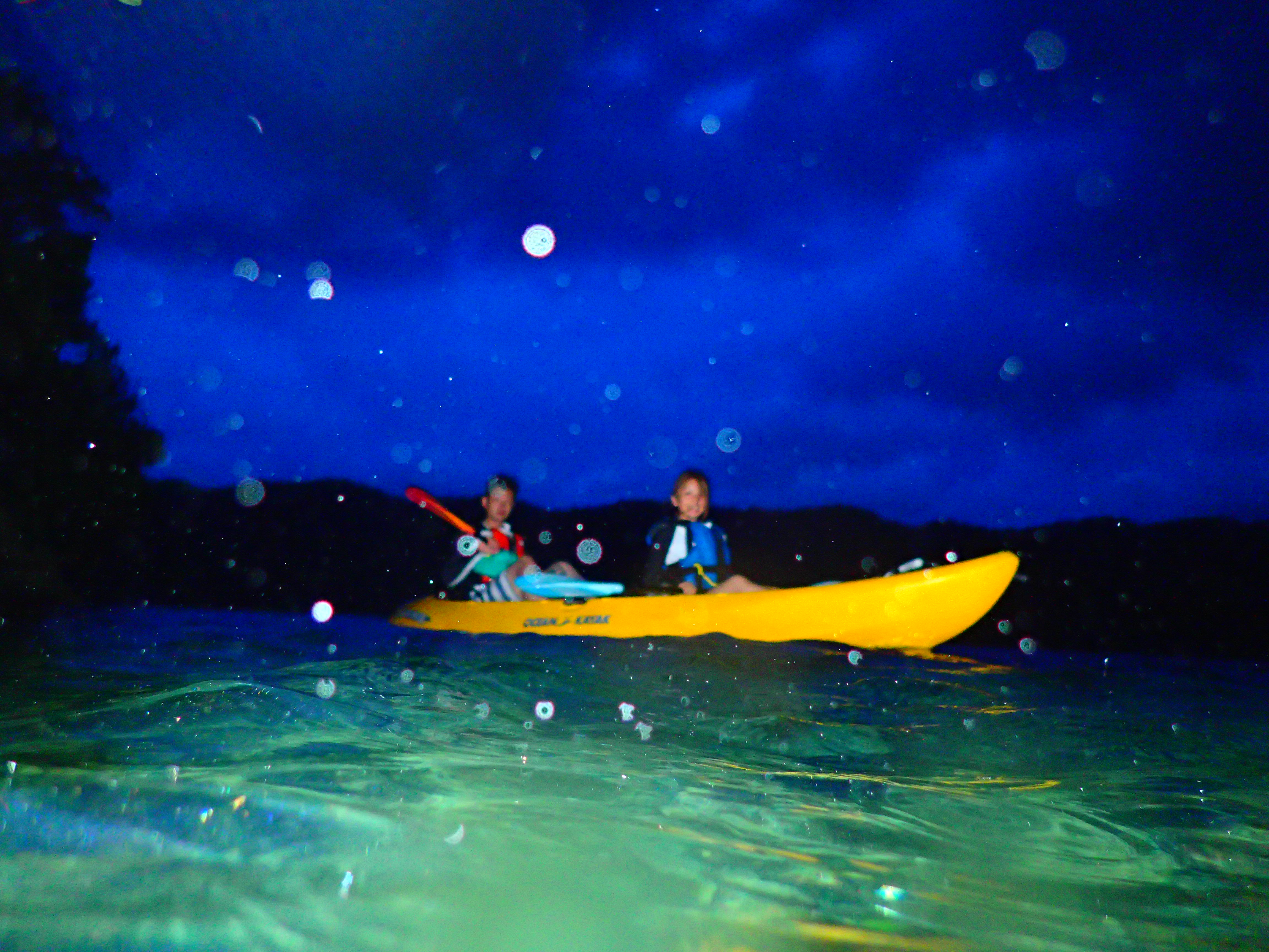 夜のカヤックは海中電灯必須!暗闇の中、島をライトで照らしながらのツアーはアドベンチャー感満載。ライトで照らすと海の色合いも綺麗です♪
