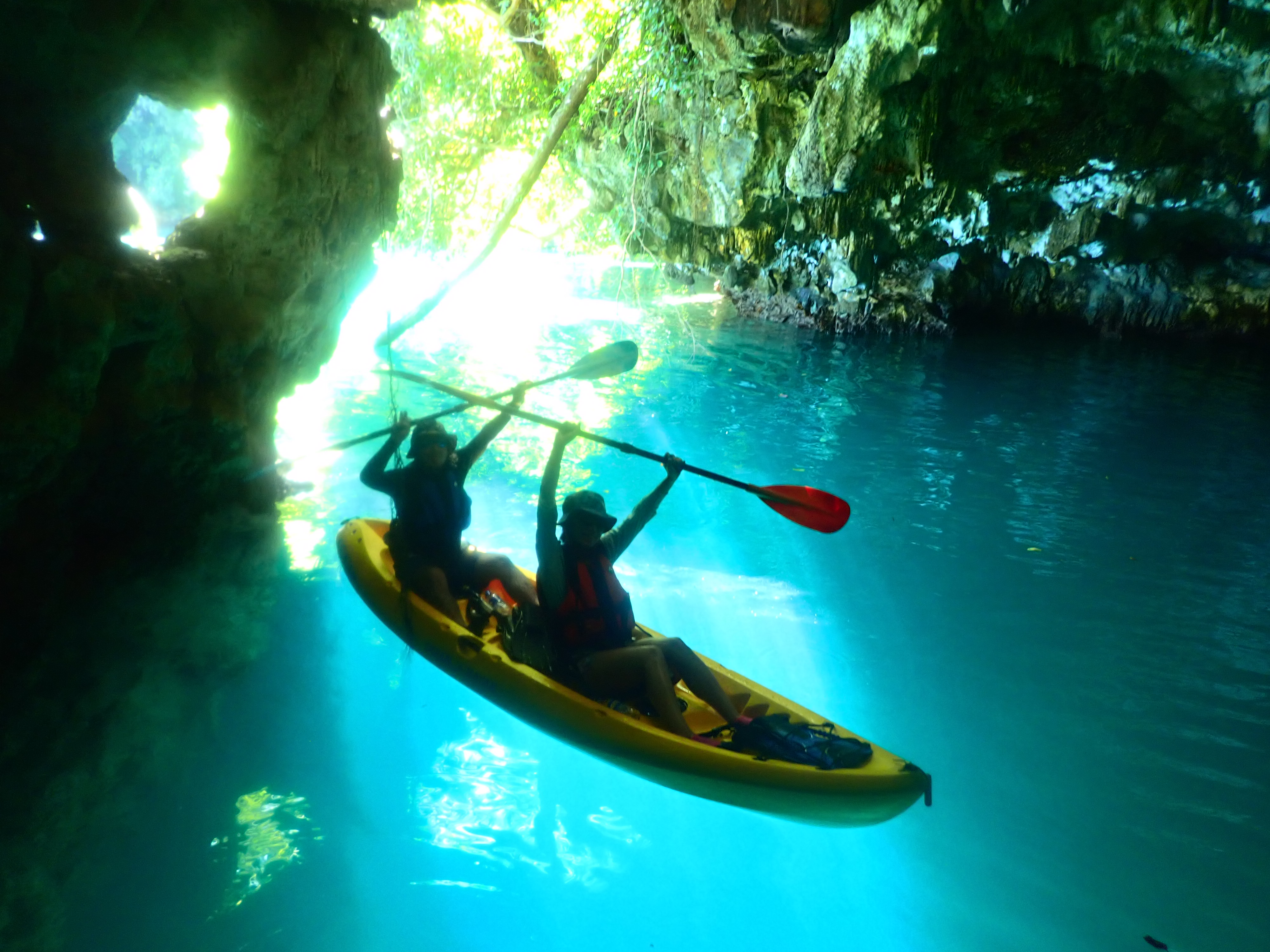 三度登場のお二人(笑)海側から見ると小さな入り口ですが、中に入るとそこはフォトジェニックな空間。天窓洞のような地形が美しい名もなきスポット。